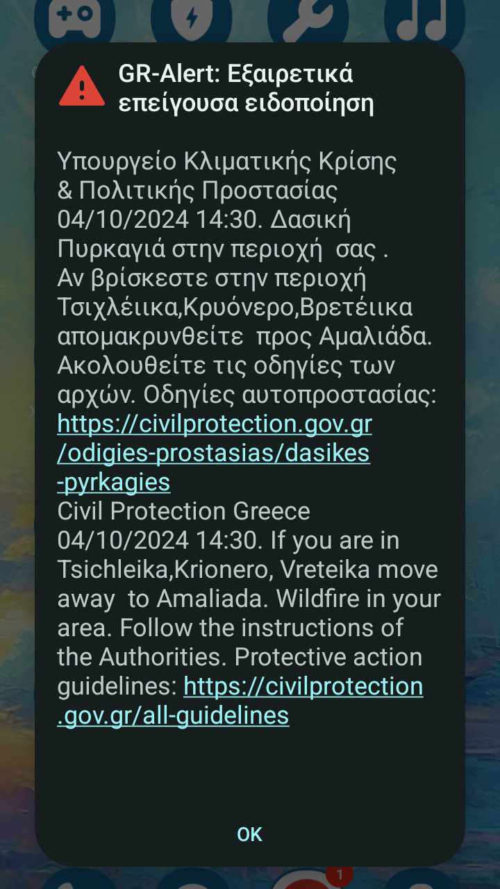 Λόγω της κρισιμότητας της κατάστασης, μάλιστα, ενεργοποιήθηκε η υπηρεσία έκτακτης ειδοποίησης του 112, καλώντας τους κατοίκους των γύρω περιοχών να εκκενώσουν άμεσα. Συγκεκριμένα, το μήνυμα του 112 αναφέρει: «Αν βρίσκεστε στην περιοχή Τσιχλέικα, Κρυόνερο, Βρετέικα, απομακρυνθείτε προς Αμαλιάδα». Οι κάτοικοι των τριών αυτών περιοχών κλήθηκαν να εγκαταλείψουν τα σπίτια τους με κατεύθυνση την Αμαλιάδα.