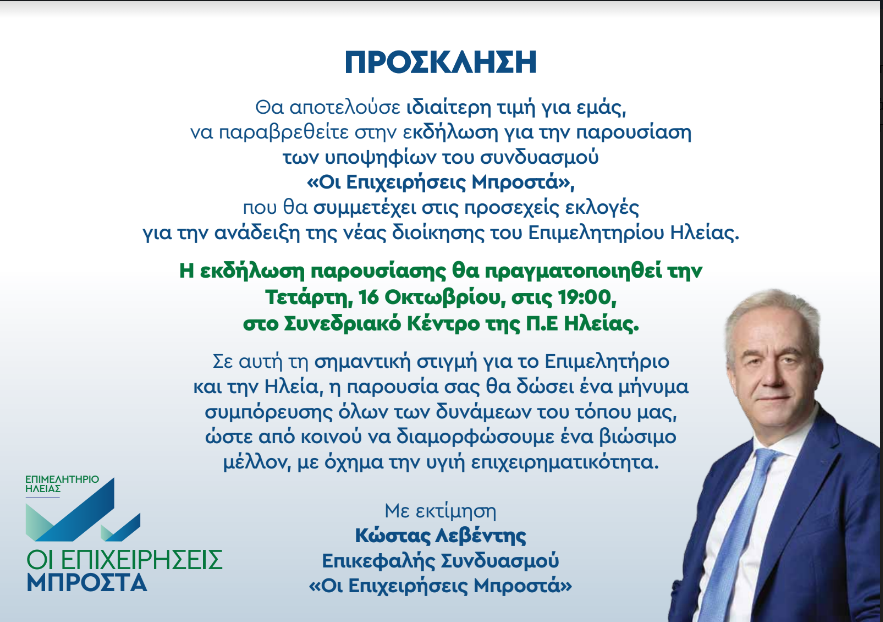 Την Τετάρτη, 16 Οκτωβρίου, στις 19:00, στον χώρο του Συνεδριακού Κέντρου της Π.Ε Ηλείας, θα πραγματοποιηθεί η εκδήλωση για την παρουσίαση των υποψηφίων του συνδυασμού «Οι Επιχειρήσεις Μπροστά», ενόψει των εκλογών για την ανάδειξη της νέας διοίκησης του Επιμελητηρίου Ηλείας.