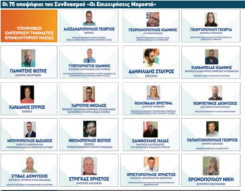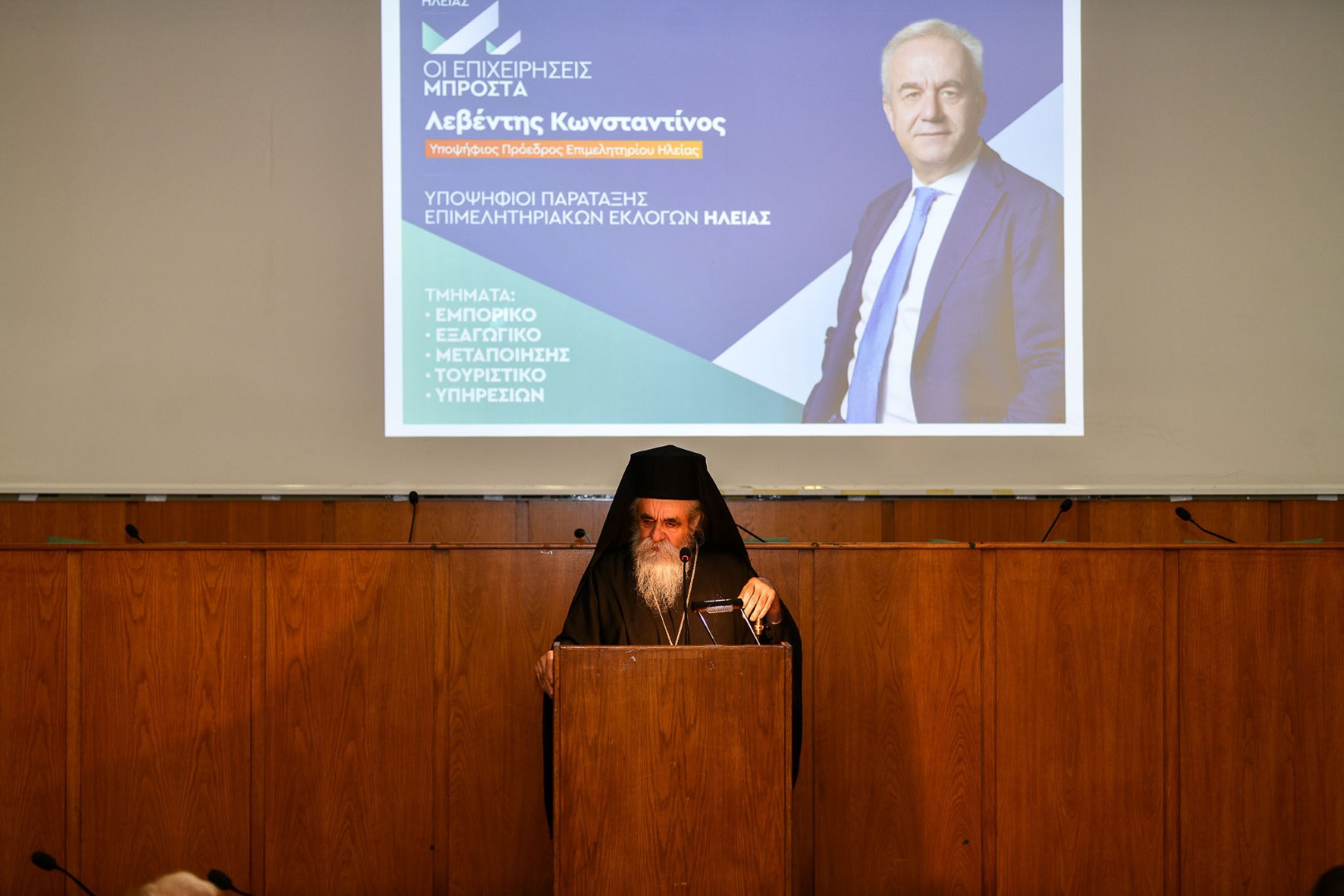 Την Τετάρτη, 16 Οκτωβρίου, στον κατάμεστο χώρο του Συνεδριακού Κέντρου της Π.Ε Ηλείας, πραγματοποιήθηκε με επιτυχία η παρουσίαση των μελών του συνδυασμού «Οι Επιχειρήσεις Μπροστά», με επικεφαλής τον κ. Κώστα Λεβέντη, ενόψει των εκλογών, που θα πραγματοποιηθούν στις 16 και 17 Νοεμβρίου. Ενώπιον πλήθους κοινού, εκπροσώπων της Τοπικής Αυτοδιοίκησης και φορέων του τόπου, ο κ. Λεβέντης παρουσίασε τους υποψηφίους του συνδυασμού, που περιλαμβάνει επιχειρηματίες από όλους τους κλάδους της επιχειρηματικότητας και από όλες τις περιοχές της Ηλείας.