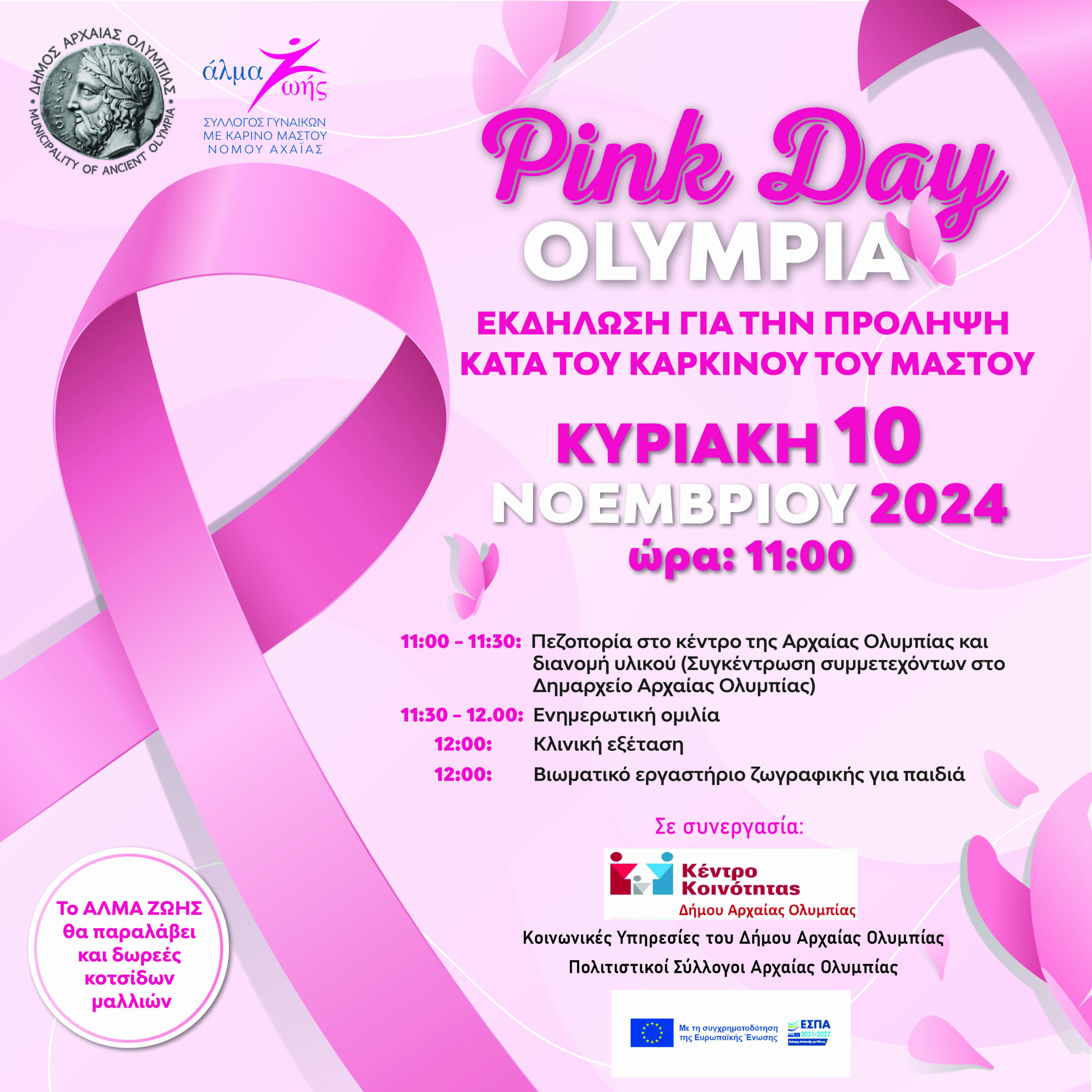 Η συγκεκριμένη δράση με τίτλο PINK DAY OLYMPIA θα πραγματοποιηθεί την Κυριακή 10 Νοεμβρίου 2024 με πεζοπορία στο κέντρο της Αρχαίας Ολυμπίας και διανομή ενημερωτικού υλικού, στην οποία οι συμμετέχοντες θα έχουν ροζ καπελάκια. Μετά την ολοκλήρωση της πεζοπορίας θα γίνει ενημερωτική ομιλία για τη σημασία της πρόληψης, Κλινική Εξέταση και Διαδραστικό εργαστήριο ζωγραφικής για παιδιά, τα οποία θα στείλουν το δικό τους μήνυμα για τη πρόληψη.