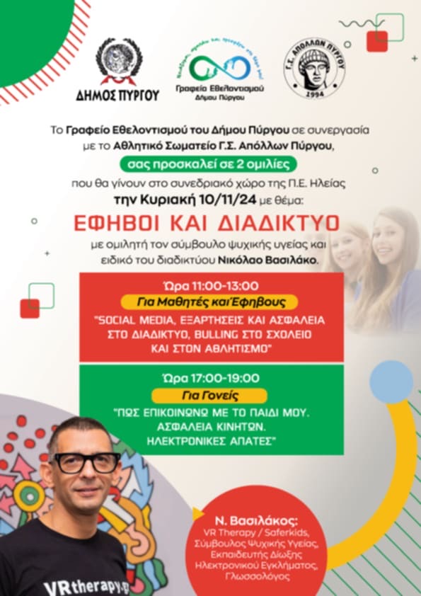 Ο Δήμος Πύργου και το Γραφείο Εθελοντισμού σε συνεργασία με το Α.Σ. Απόλλων Πύργου, διοργανώνουν την Κυριακή (10/11/24) εκδήλωση στο συνεδριακό της ΠΕ Ηλείας με θέμα: « Έφηβοι και Διαδίκτυο». Ο Ειδικός Κυβερνοασφάλειας, Tεχνικός Σύμβουλος Δίωξης Ηλ. Εγκλήματος, Πρόεδρος Internet Now κ. Νικόλαος Βασιλάκος θα αναλύσει τόσο στους μαθητές και τους εφήβους (11:00 π.μ. έως 01:00 μ.μ.) όσο και στους γονείς (17:00-19:00), τους κινδύνους που κρύβει το διαδίκτυο.