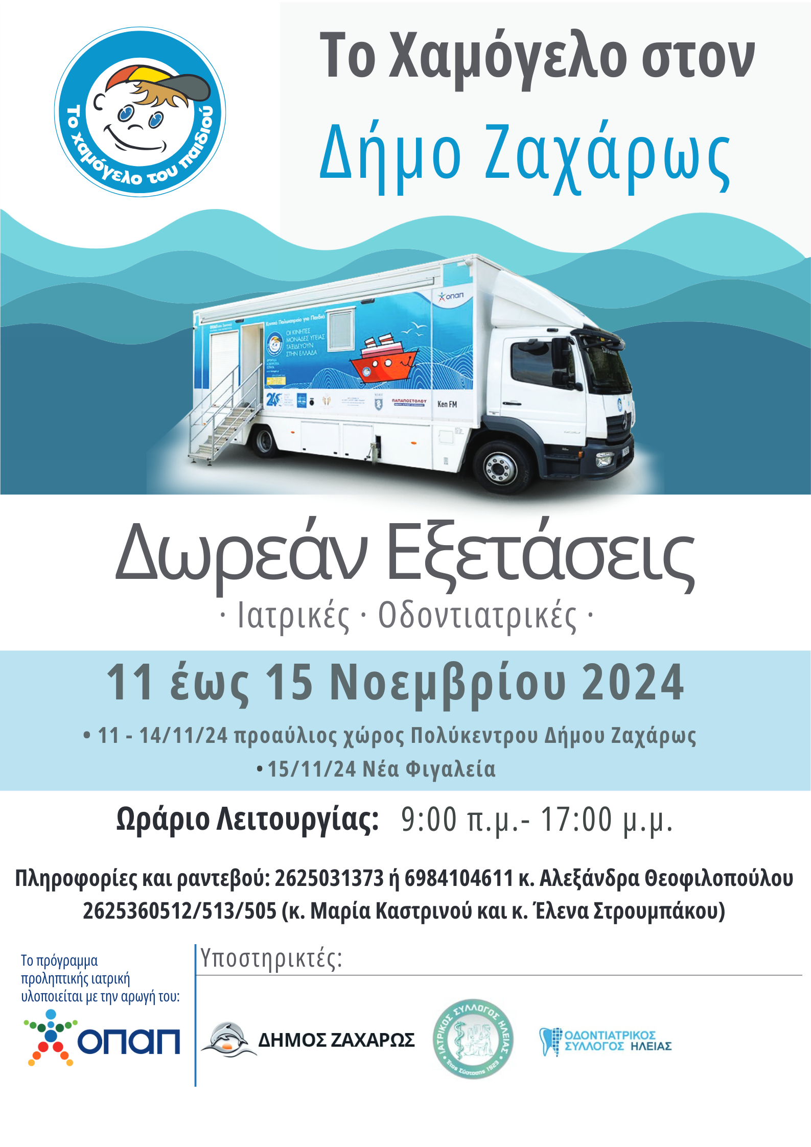 Δωρεάν Προληπτικές Ιατρικές – Οδοντιατρικές Εξετάσεις για Παιδιά από «Το Χαμόγελο του Παιδιού» στον Δήμο Ζαχάρως 11 Νοεμβρίου – 15 Νοεμβρίου 2024