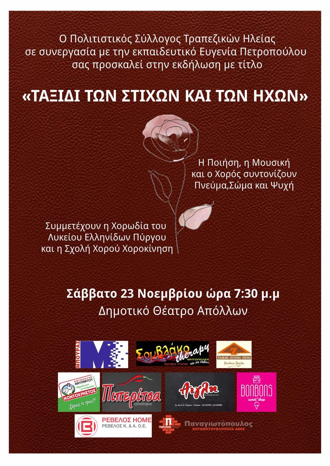 Ο Πολιτιστικός Σύλλογος Τραπεζικών Ηλείας σε συνεργασία με την κα Ευγενία Πετροπούλου, εκπ/κό θέλοντας να διαμορφώσει μια ευρύτερη κουλτούρα στην περιοχή παρουσιάζει εκδήλωση με τίτλο: «Ταξίδι των στίχων και των ήχων» από τραγούδια σπουδαίων συνθετών, ποιήματα μεγάλων ποιητών και αφήγηση κειμένων (επιμέλεια της κας Ευγενίας Πετροπούλου).