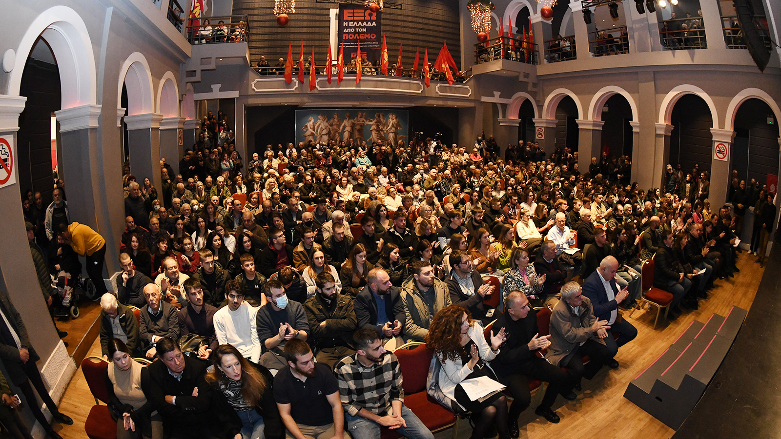 Για το δίκιο των πολλών, ενάντια στους πολέμους και τα κέρδη των λίγων”, και ομιλητή τον ΓΓ της ΚΕ του ΚΚΕ Δημήτρη Κουτσούμπα. Στην εκδήλωση βρέθηκαν αντιπροσωπείες από 105 εργατικά συνδικάτα, Ομοσπονδίες και συλλόγους βιοπαλαιστών αγροτών, μικρών επαγγελματιών, φοιτητών, μαθητικών συμβουλίων, αλλά και άλλων λαϊκών φορέων δίνοντας ένα μαχητικό “παρών”. Παρευρέθηκαν ο Δημήτρης Αρβανιτάκης, μέλος του ΠΓ της ΚΕ του ΚΚΕ, ο Νίκος Καραθανασόπουλος μέλος της ΚΕ του ΚΚΕ και βουλευτής Αχαΐας, καθώς και ο Νίκος Παπαναστάσης, βουλευτής Αιτωλοακαρνανίας του ΚΚΕ. Επίσης, βρέθηκε πολυμελής αντιπροσωπεία της Δημοτικής Αρχής με επικεφαλής τον Κώστα Πελετίδη, Δήμαρχο Πατρέων.