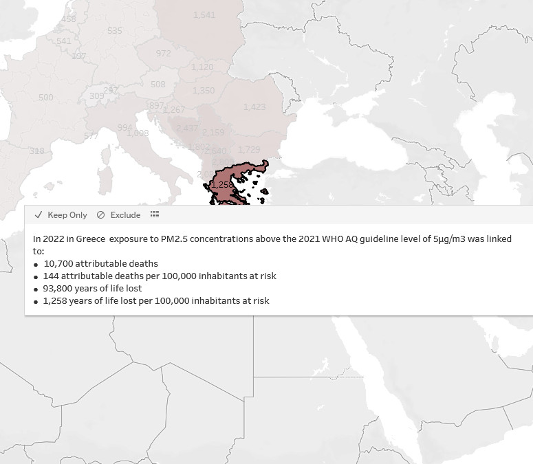 Τα στοιχεία αφορούν τη μακροχρόνια έκθεση σε ρύπανση μικροσωματιδίων μεγαλύτερη από τη συνιστώμενη συγκέντρωση από τον Παγκόσμιο Οργανισμό Υγείας (ΠΟΥ) των 5 µg/m3. Ο υψηλότερος αριθμός αποδιδόμενων στα μικροσωματίδια αυτά θανάτων το 2022 είναι κατά σειρά σε Ιταλία (48.600), Πολωνία (34.700) και Γερμανία (32.600), με τον αριθμό στην Ελλάδα να φτάνει τους 10.700 θανάτους. Η χώρα μας καταγράφει επίδοση 144 θανάτων αποδιδόμενων στα PM2,5 ανά 100.000 κατοίκους σε κίνδυνο, με τις χαμένες ώρες ζωής να ανέρχονται σε 93.800 (1.258 ώρες ζωής χαμένες ανά 100.000 κατοίκους σε κίνδυνο).