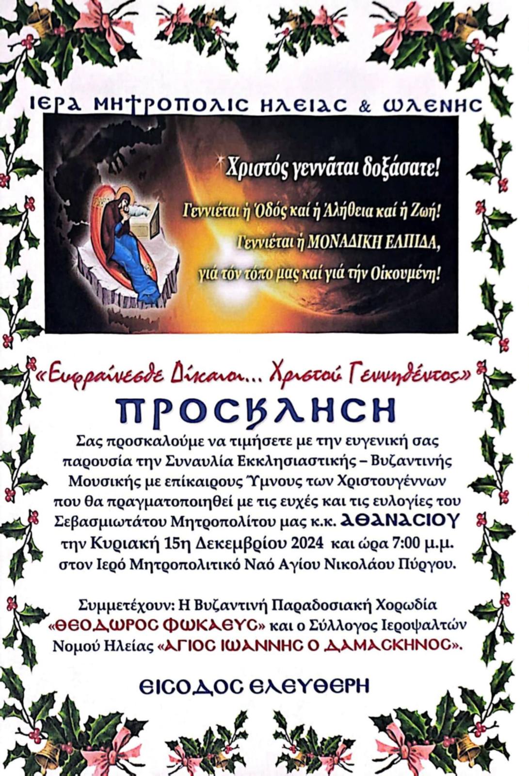 Την εκδήλωση θα ανοίξει η Βυζαντινή – Παραδοσιακή χορωδία «Θεόδωρος Φωκαεύς», η οποία θα αποδώσει επίκαιρους Βυζαντινούς ύμνους σύμφωνα με το Πατριαρχικό ύφος, υπό την διεύθυνση του χοράρχη της, Μουσικολογιωτάτου Πρωτοψάλτου κ. Χαραλάμπους Θεοτοκάτου. Την συναυλία θα ολοκληρώσει με την συμμετοχή του ο Σύλλογος Ιεροψαλτών Νομού Ηλείας «Άγιος Ιωάννης ο Δαμασκηνός», που επίσης θα ψάλλει επιλεγμένα μέλη Χριστουγέννων, υπό την διεύθυνση του χοράρχη του, Πρωτοψάλτου κ. Δημητρίου Θανόπουλου. Η είσοδος για το κοινό είναι ελεύθερη.