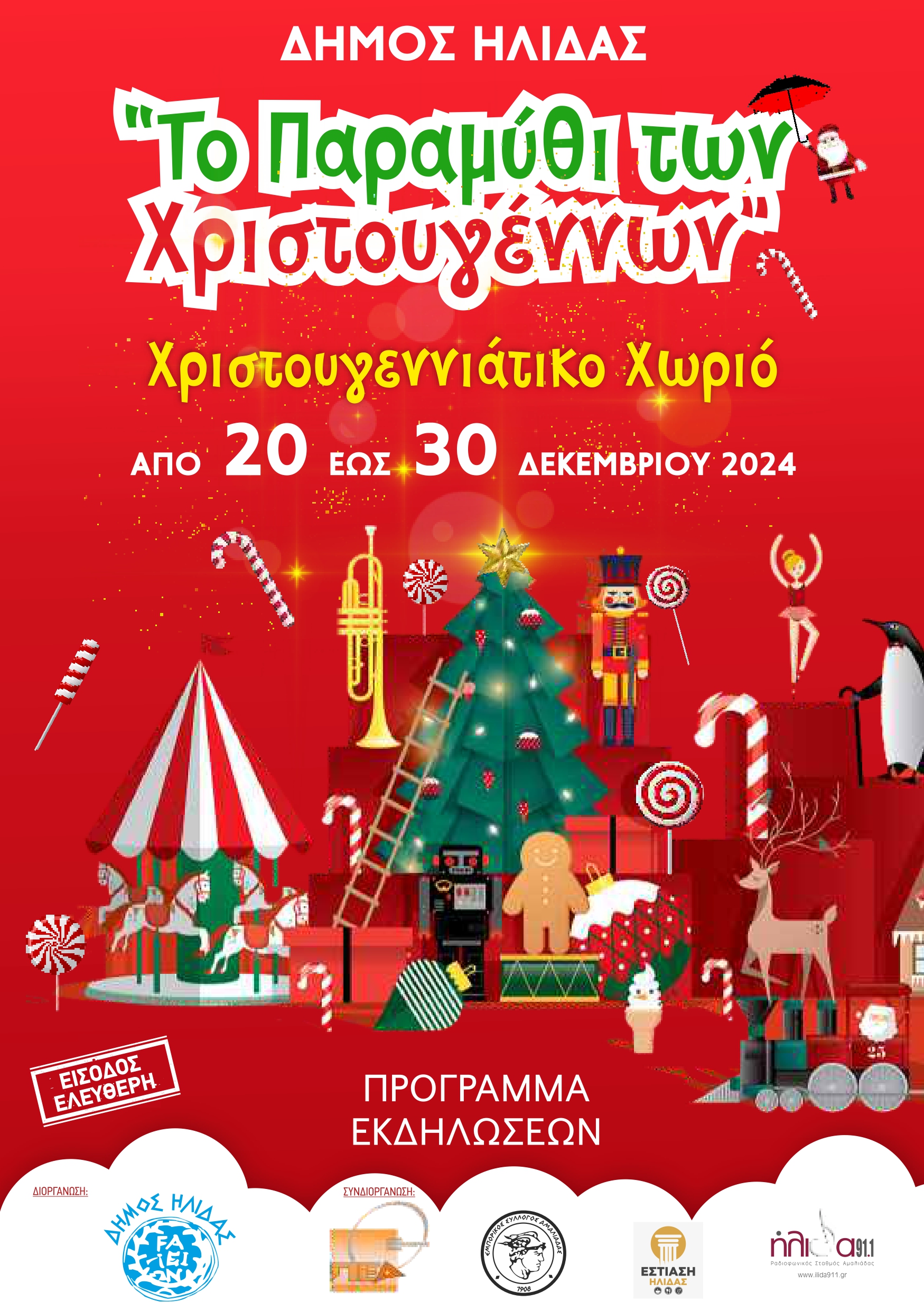 Με ένα μοναδικό εορταστικό πρόγραμμα ο Δήμος Ήλιδας υποδέχεται τα φετινά Χριστούγεννα, με το Χριστουγεννιάτικο Χωριό «Το Παραμύθι των Χριστουγέννων» να ανοίγει τις πύλες του την ερχόμενη Παρασκευή 20 Δεκεμβρίου 2024 στην πλατεία Αγίου Αθανασίου Αμαλιάδας και τις εορταστικές εκδηλώσεις να ολοκληρώνονται στις 30 Δεκεμβρίου. Παράλληλα, εκτός της πλατείας, εκδηλώσεις για μικρούς και μεγάλους θα πραγματοποιηθούν και στον Πολυχώρο Πολιτισμού Δήμου Ήλιδας, με το σύνολο του χωριού να έχει ελεύθερη είσοδο για το κοινό.