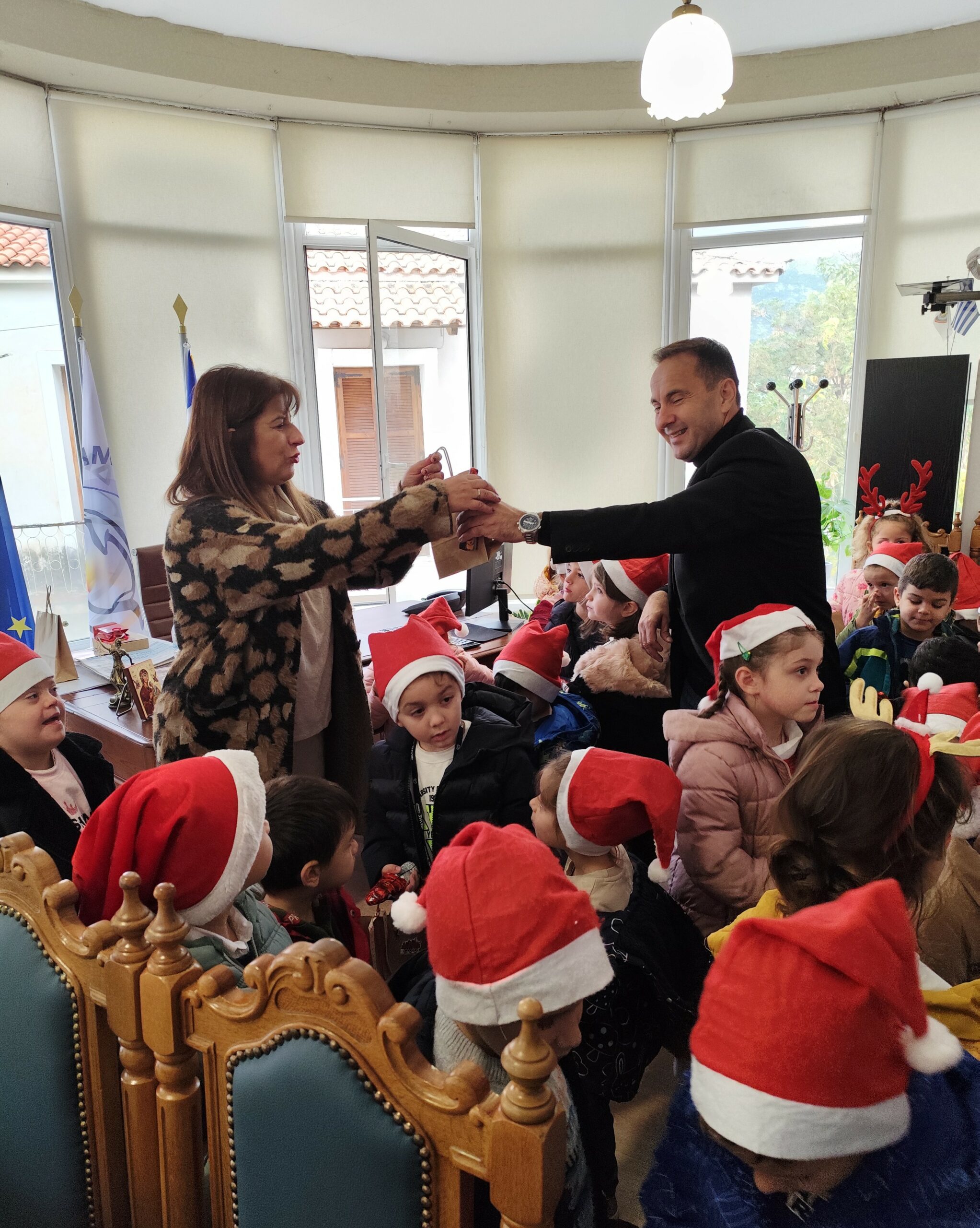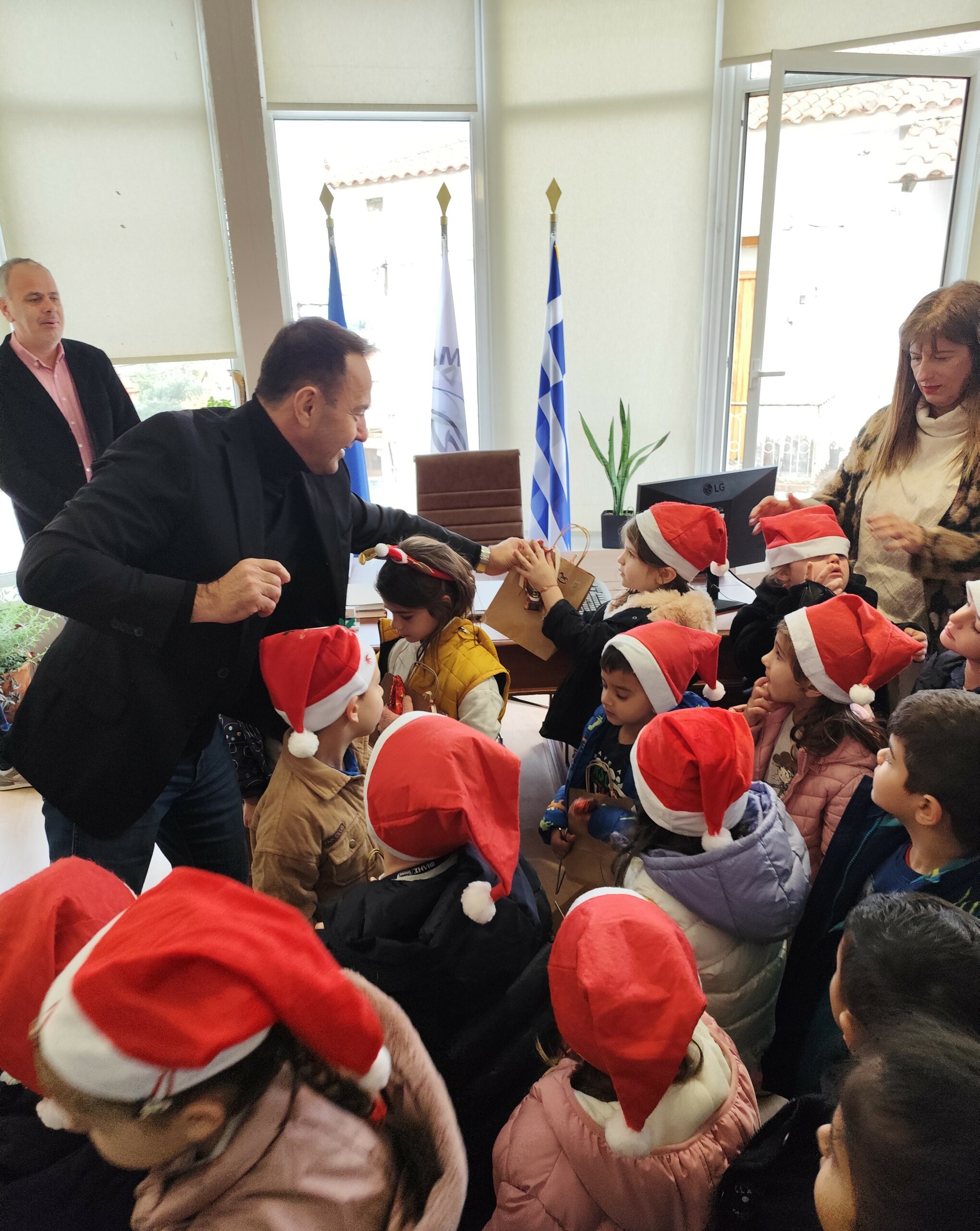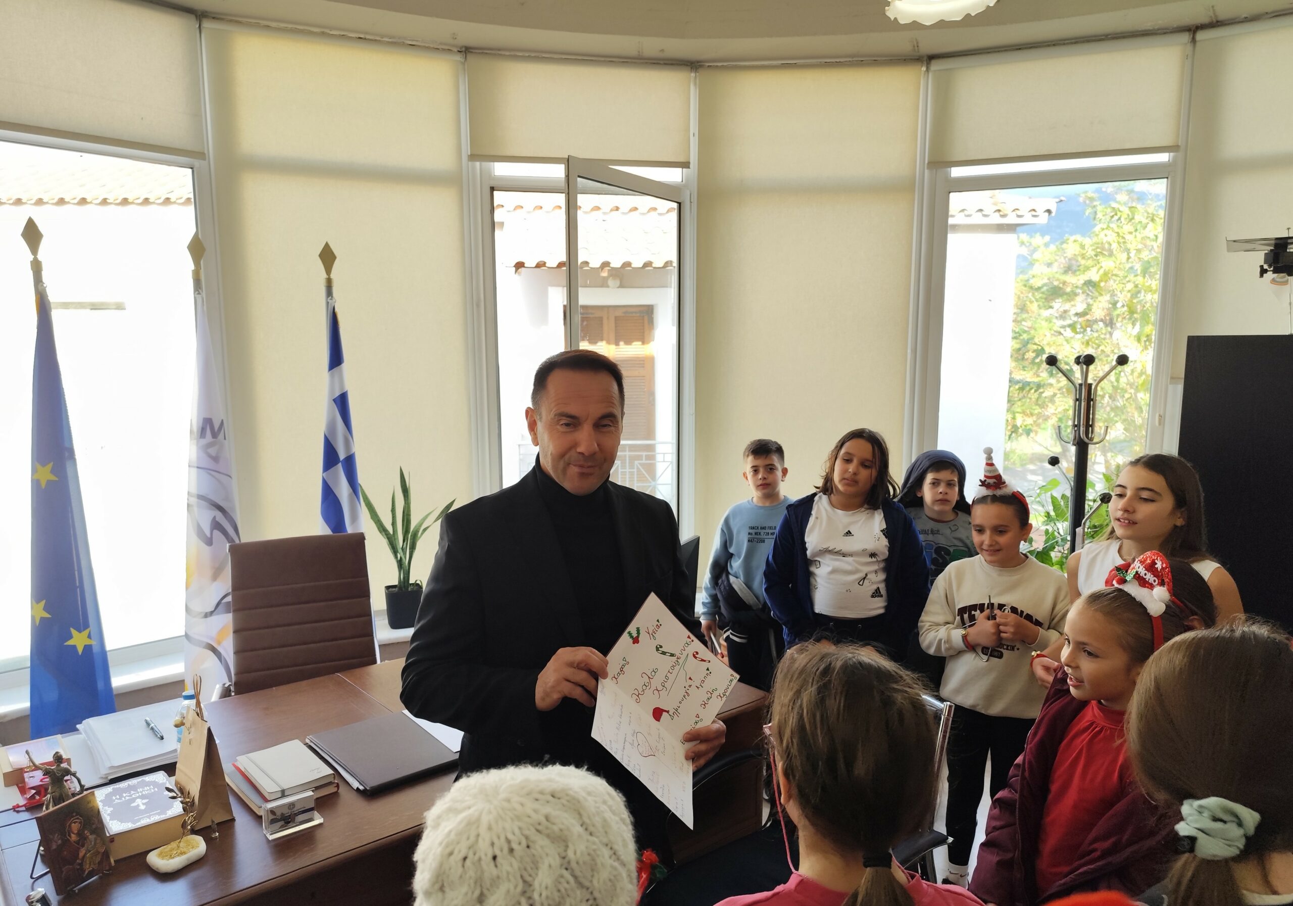 Μια ευχάριστη επίσκεψη για τον Δήμαρχο Ζαχάρως Κωνσταντίνο Μητρόπουλο, από τους μαθητές και τις μαθήτριες του 2ου Νηπιαγωγείου Ζαχάρως αλλά και την παιδική χορωδία του Δημοτικού Σχολείου Ζαχάρως. Το γραφείο του Δημάρχου γέμισε με χαρούμενες παιδικές φωνές, αφού τα παιδιά και οι συνοδοί εκπαιδευτικοί ήρθαν να πουν τα Χριστουγεννιάτικα κάλαντα.