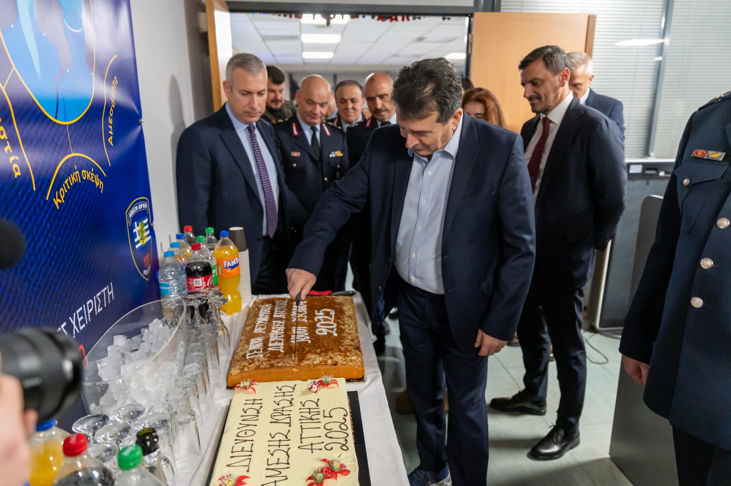 Την Πολιτική και Φυσική ηγεσία της Ελληνικής Αστυνομίας υποδέχθηκε ο Γενικός Αστυνομικός Διευθυντής Αττικής, Υποστράτηγος Ιωάννης Σκούρας, ενώ στη συνέχεια ο κ. Υπουργός, απηύθυνε μέσω ασυρμάτου τις ευχές σε αστυνομικούς που υποδέχτηκαν το 2025 εν ώρα υπηρεσίας: «Σας εύχομαι σε όλες και όλους χρόνια πολλά, καλή χρονιά. Να είστε υγιείς, δυνατοί, ευτυχισμένοι, εσείς και οι οικογένειές σας. Σας οφείλουμε ένα μεγάλο ευχαριστώ γιατί τις ώρες αυτές, που όλοι οι Έλληνες και όλος ο πλανήτης γιορτάζει την είσοδο του νέου χρόνου, εσείς εργάζεστε. Γι’ αυτό αξίζετε ένα μεγάλο έπαινο, αξίζετε την ευγνωμοσύνη μας και να είστε βέβαιοι ότι θα σας την ανταποδίδουμε συνέχεια, με τον καλύτερο δυνατό τρόπο. Σας εύχομαι υγεία, δύναμη, ευτυχία. Να είστε όλοι και όλες καλά.»