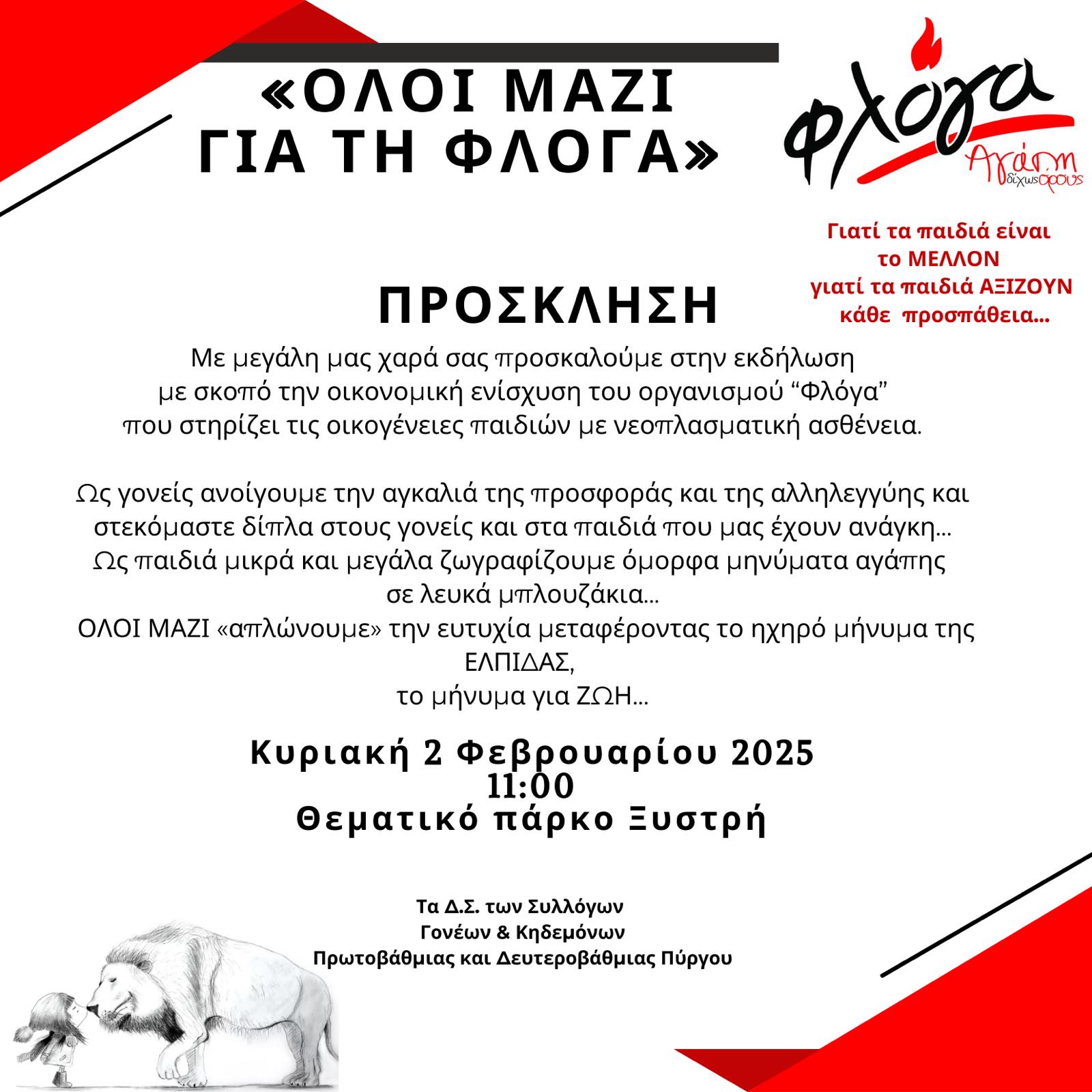 Οι Σύλλογοι Γονέων και Κηδεμόνων Πρωτοβάθμιας και Δευτεροβάθμιας εκπαίδευσης Δήμου Πύργου, ενώνουν τις δυνάμεις τους και προσκαλούν μικρούς και μεγάλους στην εκδήλωση που θα πραγματοποιηθεί την Κυριακή 2 Φεβρουαρίου 2025, στις 11:00 το πρωί, στο Θεματικό Πάρκο Ξυστρή, για την ενίσχυση του οργανισμού «Φλόγα» που στηρίζει οικογένειες παιδιών με νεοπλασματική ασθένεια. Ως γονείς ανοίγουμε την αγκαλιά μας, μία αγκαλιά προσφοράς και αλληλεγγύης. Στεκόμαστε δίπλα στους γονείς και στα παιδιά που δίνουν τη δική τους μάχη με τις νεοπλασματικές ασθένειες, στηρίζοντας ενεργά το έργο του συλλόγου «Φλόγα» .