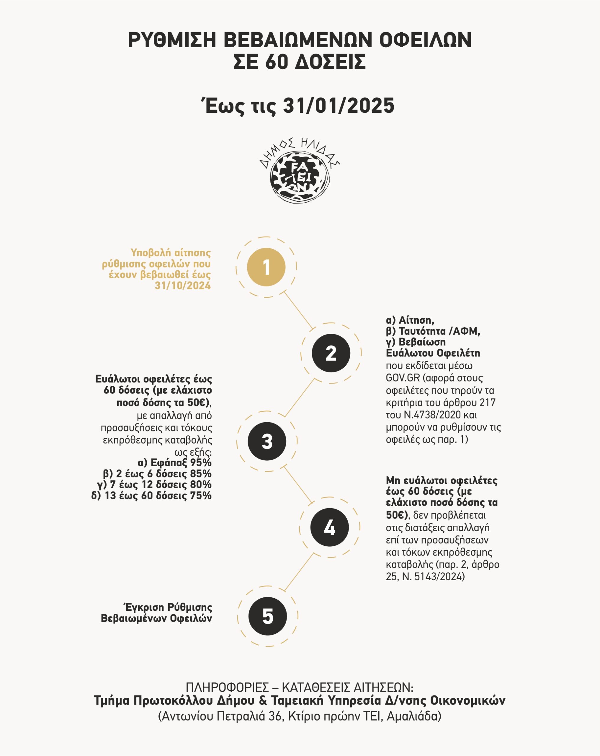 Προθεσμία μέχρι τις 31 Ιανουαρίου 2025 έχουν οι δημότες, προκειμένου να ρυθμίσουν σε 60 δόσεις τις οφειλές τους προς το Δήμο Ήλιδας, ενώ στις ευνοϊκές ρυθμίσεις μπορούν να ενταχθούν κάθε είδους οφειλές που έχουν βεβαιωθεί έως τις 31 Οκτωβρίου 2024.