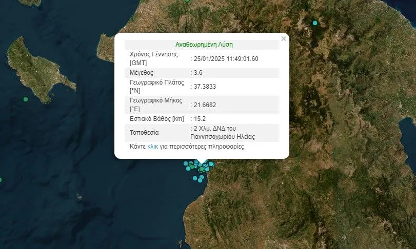 Σεισμός μεγέθους 3,6 βαθμών της κλίμακας Ρίχτερ, σημειώθηκε το μεσημέρι του Σαββάτου (25/01) στη Ζαχάρω Ηλείας. Σύμφωνα με την αναθεωρημένη λύση του Γεωδυναμικού Ινστιτούτο, ο σεισμός σημειώθηκε 2 Χλμ. νοτιοδυτικά του Γιαννιτσοχωρίου Ηλείας.