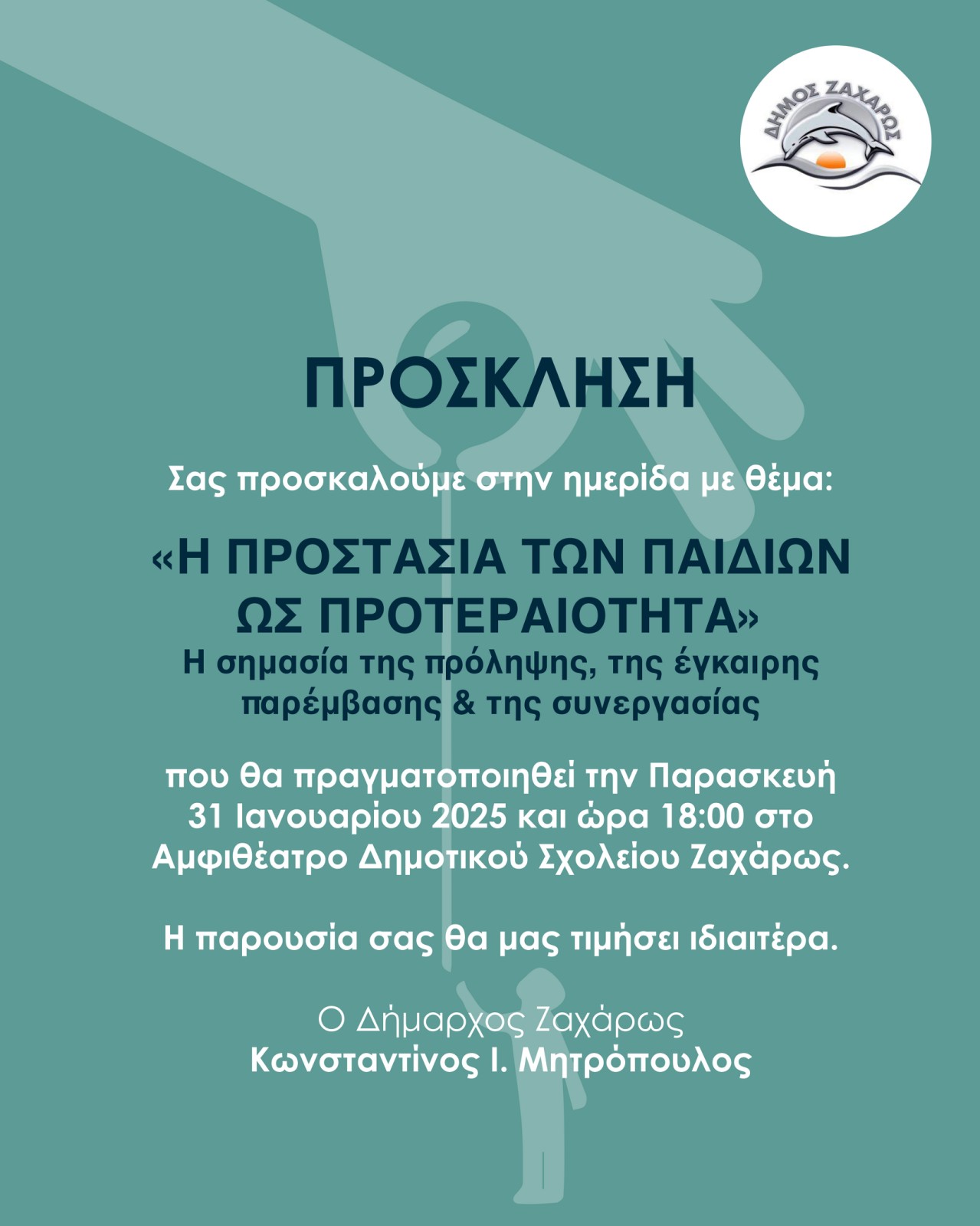 Ο Δήμος Ζαχάρως σας προσκαλεί στην ημερίδα με θέμα τα δικαιώματα των παιδιών με τίτλο: «H ΠΡΟΣΤΑΣΙΑ ΤΩΝ ΠΑΙΔΙΩΝ ΩΣ ΠΡΟΤΕΡΑΙΟΤΗΤΑ» Την Παρασκευή 31 Ιανουαρίου 2025, ώρα 18:00, στο Αμφιθέατρο του Δημοτικού Σχολείου Ζαχάρως.