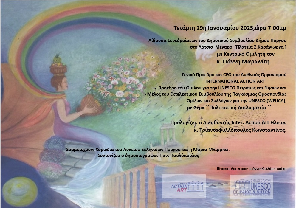 Εξαιρετικό ενδιαφέρον παρουσιάζει η κορυφαία εκδήλωση που προετοιμάζεται από το Παρ/μα Ηλείας του Διεθνούς Οργανισμού International Action Art,για την Τετάρτη 29η Ιανουαρίου,ώρα 7 μμ ,στην Αίθουσα Συνεδριάσεων του Δημοτικού Συμβουλίου Δήμου Πύργου ,στο Λατσειο Μεγαρο , σε Ομιλία με Κεντρικό Ομιλητή τον κ.Ιωάννη Μαρωνίτη , Γενικό Πρόεδρο και CEO του Διεθνούς Οργανισμού International Action Art, Πρόεδρο του Ομίλου για την UNESCO Πειραιώς και Νήσων και Μέλος του Εκτελεστικού Συμβουλίου της Παγκόσμιας Ομοσπονδίας Ομίλων και Συλλόγων για την UNESCO (WFUCA), με Θεμα ΄΄Πολιτιστική Διπλωματία ΄΄