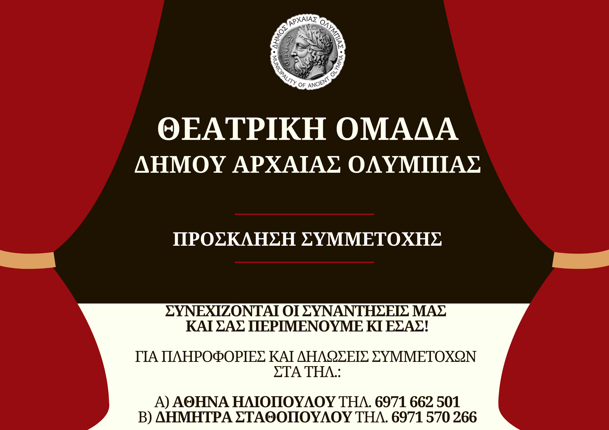 Για το λόγο αυτό, ο Δήμος Αρχαίας Ολυμπίας απευθύνει εκ νέου ανοιχτό κάλεσμα για συμμετοχές, σε όλους όσους αγαπούν το θέατρο και ενδιαφέρονται να ασχοληθούν ερασιτεχνικά. Για τη συμμετοχή δεν είναι απαραίτητη η προηγούμενη ενασχόληση με το θέατρο.