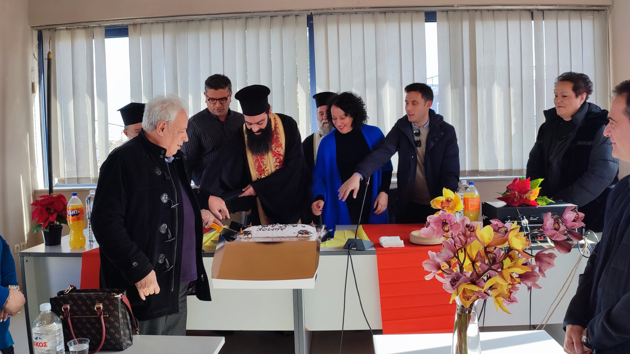 Με την ευλογία των σεβαστών Πατέρων ο Δήμαρχος Ανδραβίδας-Κυλλήνης κ. Γιάννης Λέντζας έκοψε την πρωτοχρονιάτικη πίτα των εργαζομένων του Δήμου, στην κατάμεστη αίθουσα συνεδριάσεων του Δημοτικού Συμβουλίου, στο Δημαρχείο Λεχαινών.