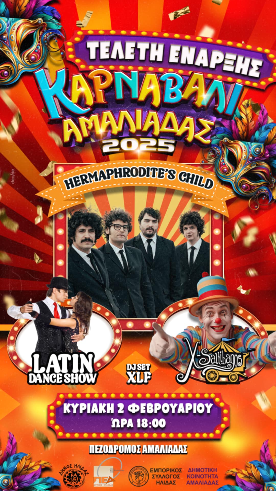 Ο Δήμος Ήλιδας στην εκδήλωση προσκαλεί όλους τους πολίτες της Ηλείας, τους καρναβαλιστές του Δήμου και τους δεκάδες εθελοντές του θεσμού, προκειμένου να διασκεδάσουν με την καρδιά τους στη μεγάλη γιορτή της πόλης. Αμέσως μετά στη σκηνή θα βρεθούν οι σχολές χορού «Danceteria» και «Step Up», οι οποίες αναμένεται να δώσουν το δικό τους μοναδικό τόνο, παρουσιάζοντας με τα τμήματά τους ένα μοναδικό σόου από ρυθμούς latin, tango και salsa. Και αφού ολοκληρωθεί το πρόγραμμα, τη σκυτάλη θα πάρουν οι ξυλοπόδαροι και ζογκλέρ της ομάδα «X-Saltibagos», σε ένα ξεχωριστό σόου που θα περιλαμβάνει και φωτιές, ενθουσιάζοντας όλους τους παρευρισκόμενους, ενώ, παράλληλα, ο Dj «XLF» (Γιάννης Σπυρούνης) θα δημιουργήσει ένα μοναδικό αποκριάτικο κλίμα σε όλη την Αμαλιάδα.