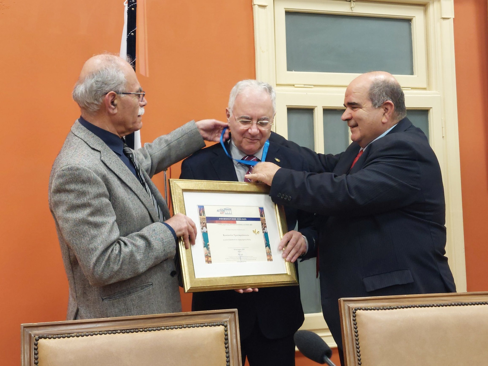 Μαλιστα επέδωσε ειδική πλακέτα επαίνου και μετάλλιο στον κ.Κώστα Τριανταφυλλόπουλο, εξαίροντας το σημαντικό έργο του ευχόμενος την ίδια επιτυχία και το νέο έτος και υποσχέθηκε την άμεση συμπαράστασή του.Η επίδοση έγινε μαζί με τον Δήμαρχο Πύργου κ.Στάθη Καννή ,ο οποίος εξέφρασε τον θαυμασμό του για το έργου της Inter.Action Art, και δήλωσε την διάθεση για συνεργασία σε όλους τους τομείς των δραστηριοτήτων της.