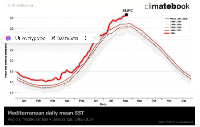 Δορυφορικές παρατηρήσεις από το 1982 και έπειτα έδειξαν ότι κατά τη διάρκεια του καλοκαιριού του 2024 σημειώθηκαν οι θερμότερες συνθήκες τα τελευταία σαράντα χρόνια σε ολόκληρη την περιοχή του Αιγαίου, του Ιονίου και του Κρητικού Πελάγους. Αποτέλεσμα όλων αυτών είναι να αυξάνεται η πιθανότητα ισχυρών καταιγίδων και κατ’ επέκταση πλημμυρών, ιδίως δε σε περιοχές που στερούνται αντιπλημμυρικών έργων ή/και που έχουν πληγεί από πυρκαγιές και άλλες παρεμβάσεις στο τοπίο. Τα εντεινόμενα καιρικά φαινόμενα επιφέρουν τεράστιο κόστος για την οικονομία της Ευρωπαϊκής Ένωσης (ΕΕ).