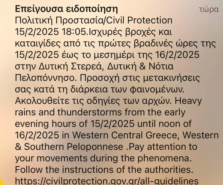 Προειδοποιητικό μήνυμα από το «112» εστάλη το απόγευμα του Σαββάτου (15/2) σε δυτική Ελλάδα, Πελοπόννησο και νησιά του Ιονίου.