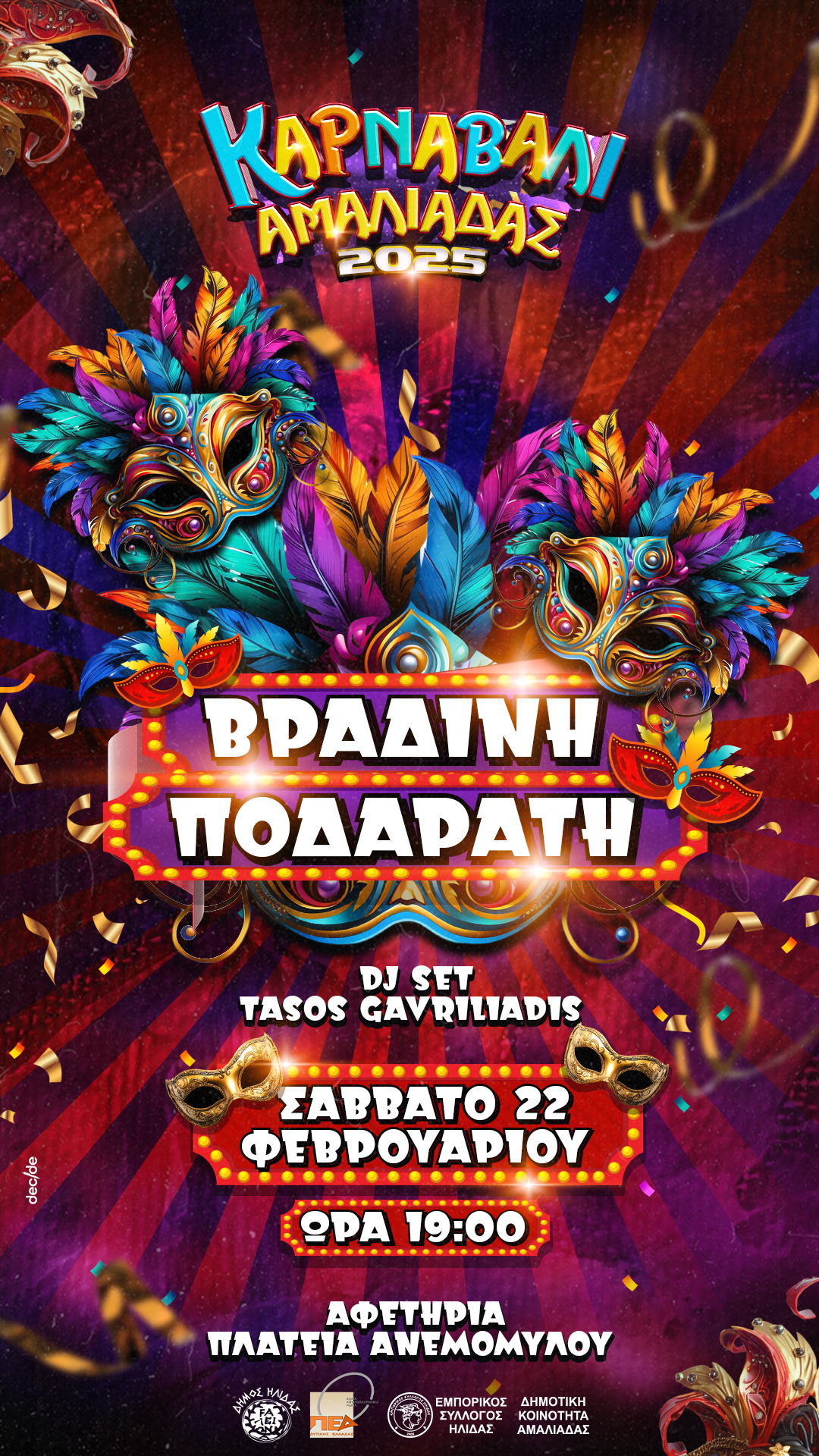 Όλοι τους κρατούν το κέφι και το μπρίο, αρχικά για τη Νυχτερινή Ποδαράτη παρέλαση του Σαββάτου 22 Φεβρουαρίου 2025, η οποία θα ξεκινήσει στις 19:00 το απόγευμα από την πλατεία Ανεμομύλου, με παρουσιάστριες τη Σοφία Ζαχαροπούλου και τη Νίκη Μπουτζαρελη. Μετά την παρέλαση η διασκέδαση και τα καρναβαλικά χρώματα θα μεταφερθούν στην κεντρική πλατεία και στον πεζόδρομο της Αμαλιάδας, σε ένα ολονύκτιο καρναβαλικό πάρτι.