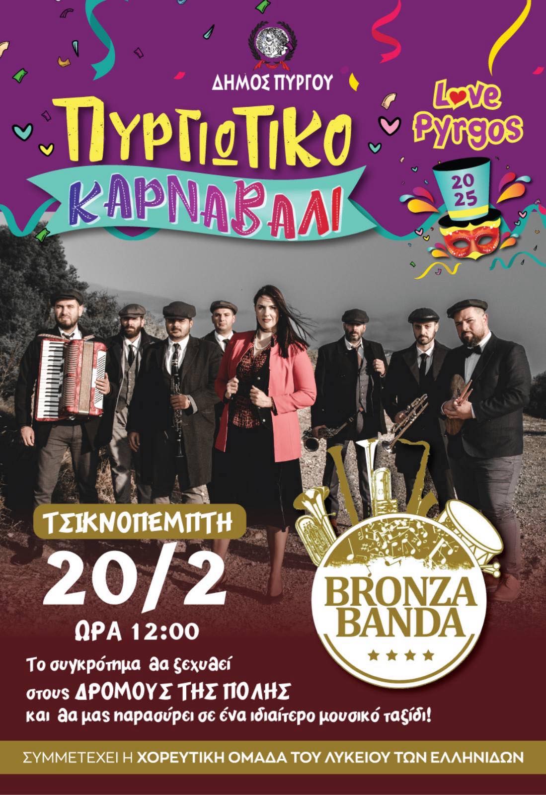 Ο Δήμος Πύργου στο πλαίσιο των αποκριάτικων εκδηλώσεων 2025 διοργανώνει την Τσικνοπέμπτη (20/02/25) μουσική περατζάδα με το μουσικό συγκρότημα χάλκινων πνευστών Bronza Banda, ενώ το Λύκειο Ελληνίδων θα παρουσιάσει το γνωστό σε όλους Γαϊτανάκι. Το γνωστό συγκρότημα των χάλκινων πνευστών θα διασχίσει τους δρόμους της πόλης παρασέρνοντας μικρούς και μεγάλους σε ένα ξεχωριστό μουσικό ταξίδι.