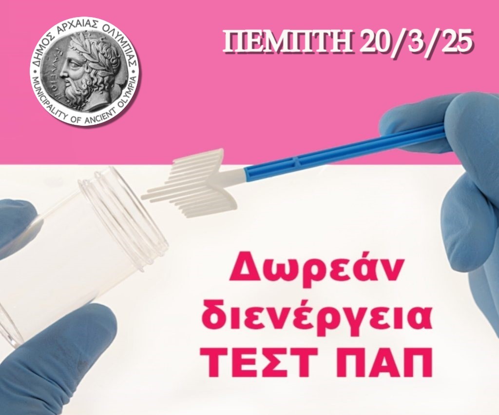 Ο Δήμος Αρχαίας Ολυμπίας, μέσω του Τμήματος Κοινωνικής Προστασίας και του Κέντρου Κοινότητας, σε συνεργασία με το Δίκτυο Πρωτοβάθμιων Υπηρεσιών Υγείας Μαιών της Νοσηλευτικής Μονάδας Αμαλιάδας και το Κέντρο Υγείας Αρχαίας Ολυμπίας, πραγματοποιεί δωρεάν προληπτικό γυναικολογικό έλεγχο (ΤΕΣΤ ΠΑΠΑΝΙΚΟΛΑΟΥ) την Πέμπτη 20 Μαρτίου.