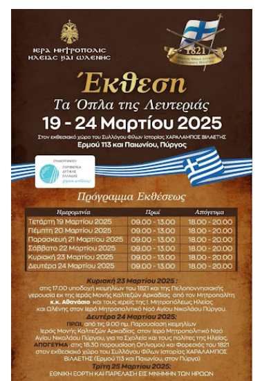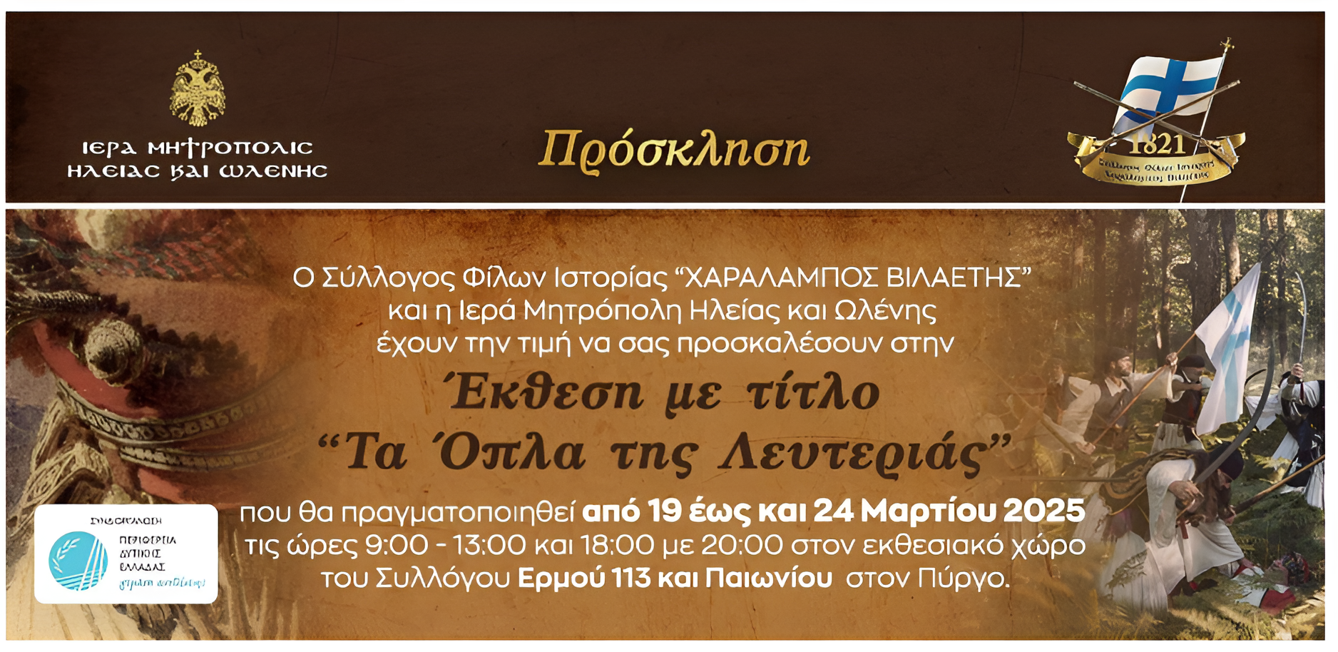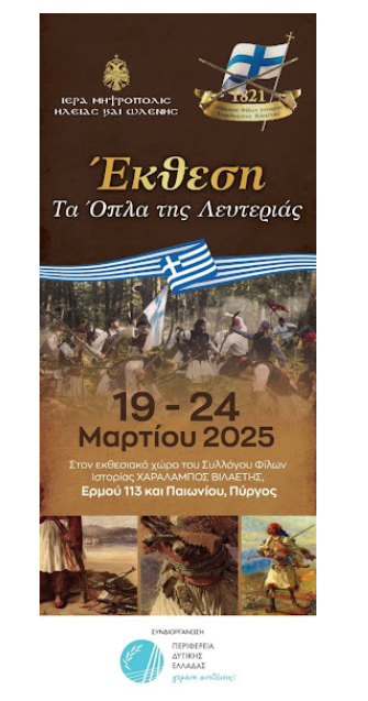 Μία σημαντική πρωτοβουλία, με την ευκαιρία της Εθνικής επετείου της 25ης Μαρτίου, θα φιλοξενήσουν στα τέλη Μαρτίου 2025 η Ιερά Μητρόπολις Ηλείας και Ωλένης και ο Σύλλογος Φίλων Ιστορίας «Χαράλαμπος Βιλαέτης». Πρόκειται για την δημιουργία εκθέσεως για τα Όπλα και τις Φορεσιές του 1821, που θα λάβει χώρα από 19 έως 24 Μαρτίου 2025.