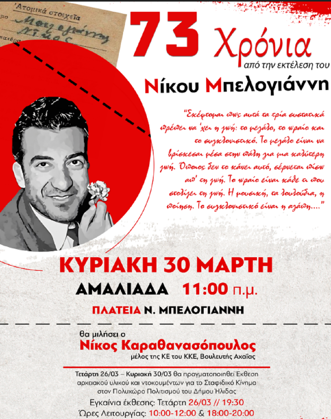 Νίκος Μπελογιάννης. Ένα όνομα θρύλος. Ένας κομμουνιστής ήρωας, που η αφοσίωσή του στο ΚΚΕ και στον λαό παραμένει φάρος στους σύγχρονους αγώνες. Για καθέναν και καθεμία που δεν βολεύεται με τ’ άδικο. Που παλεύει να ξεπατώσει την ταξική του ρίζα, να ανατρέψει το σύστημα που το γέννησε και το γεννά.