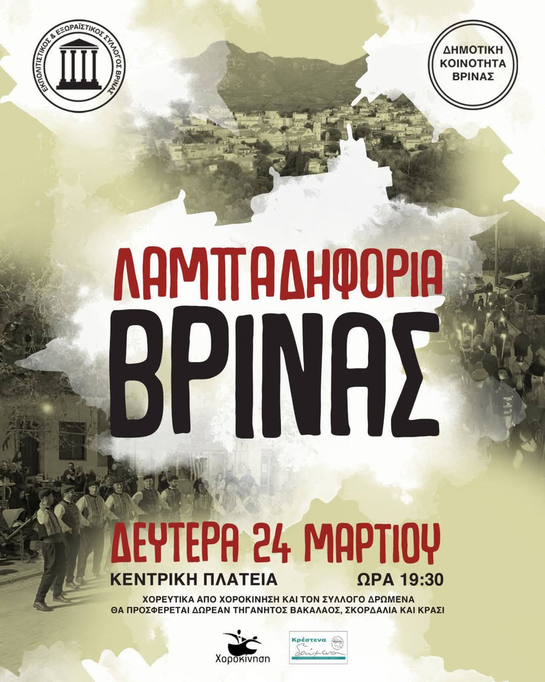 Στις 19:30 μ.μ. έχει προγραμματιστεί να γίνει Λαμπαδηφορία στην Τ.Κ. Βρίνας, με σημείο έναρξης την κεντρική πλατεία του χωριού. Να αναφερθεί ότι λόγω του αδόκητου θανάτου του πρ. Δημοτικού Συμβούλου Παναγιώτη Κομπορόζου, ματαιώθηκε η λαμπαδηφορία που είχε προγραμματιστεί από το Δήμο στις 7 μ.μ. στην Κρέστενα, με αφετηρία την ανατολική πλατεία της πόλης και τερματισμό στην κεντρική πλατεία.