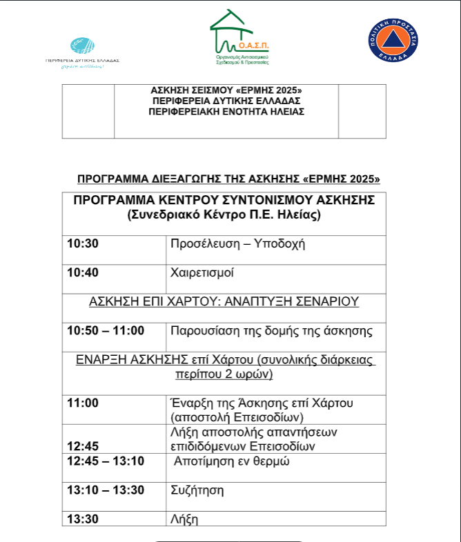 Επιπλέον, στο πλαίσιο της άσκησης «ΕΡΜΗΣ – ΠΥΡΓΟΣ 2025», σήμερα στις 6 μ.μ., στο Συνεδριακό Κέντρο της Π.Ε. Ηλείας στον Πύργο, από τον ΟΑΣΠ, θα πραγματοποιηθεί ενημέρωση όλων των διευθυντών και όλων των εκπαιδευτικών των σχολικών μονάδων Α/θμιας και Β/θμιας εκπαίδευσης, των παιδικών σταθμών (κρατικών και ιδιωτικών) και των ΚΔΑΠ με θέμα «Αντισεισμική Προστασία σε Σχολικές Μονάδες, Παιδικούς Σταθμούς και ΚΔΑΠ».