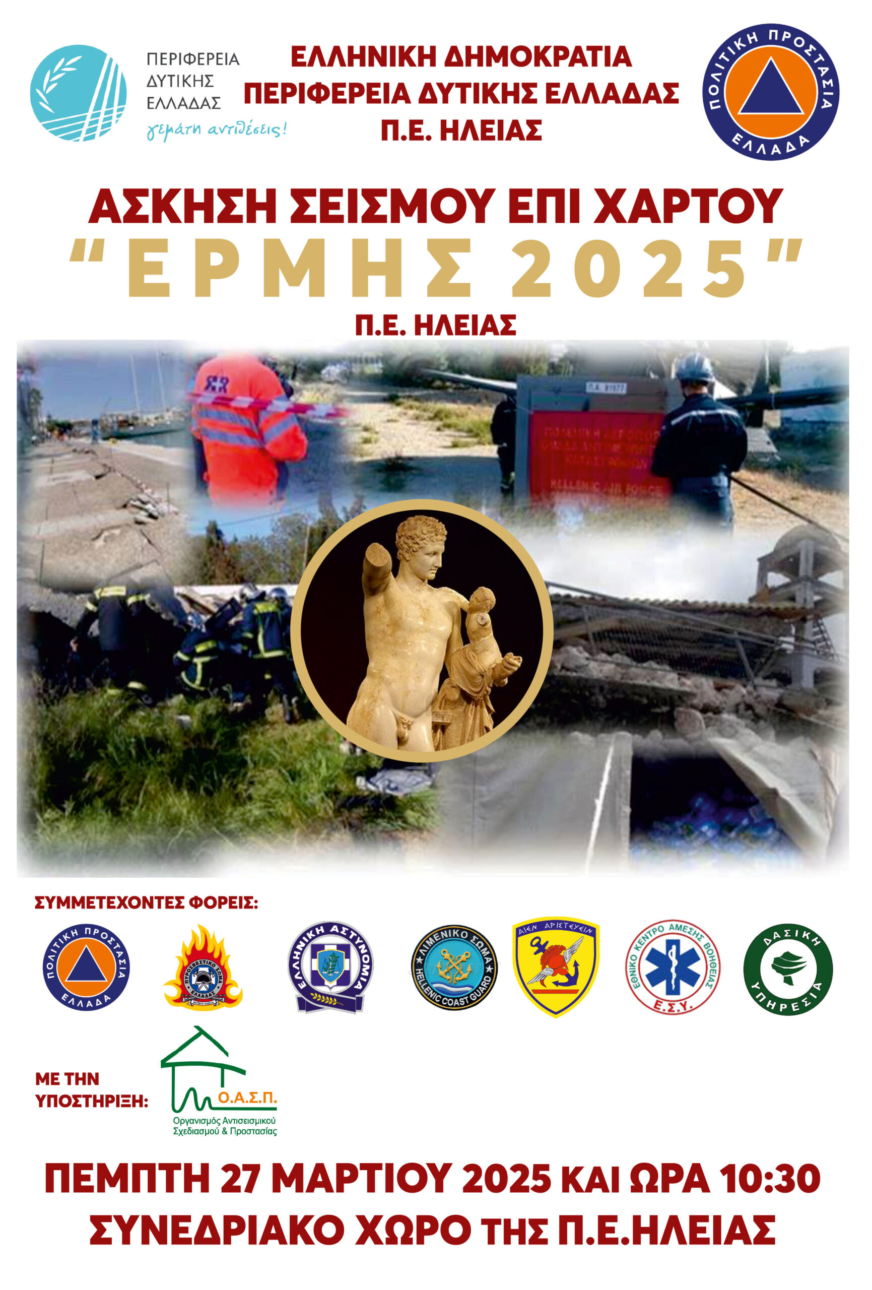 Εκπαιδευτική άσκηση επί χάρτου για την αντιμετώπιση κινδύνων λόγω σεισμικών φαινομένων και διαχείρισης των επιπτώσεων αυτών, με την κωδική ονομασία «ΕΡΜΗΣ 2025» θα πραγματοποιηθεί αύριο, Πέμπτη, 27 Μαρτίου 2025, και ώρα 10.30 π.μ. στο Συνεδριακό Κέντρο της Π.Ε. Ηλείας στον Πύργο, με πρωτοβουλία του Αντιπεριφερειάρχη Ηλείας, Νίκου Κοροβέση και του Τμήματος Πολιτικής Προστασίας της Π.Ε. Ηλείας, με την υποστήριξη του Οργανισμού Αντισεισμικού Σχεδιασμού & Προστασίας και με συμμετέχοντες φορείς τα Σώματα Ασφαλείας, το ΕΣΥ και την Δασική Υπηρεσία.