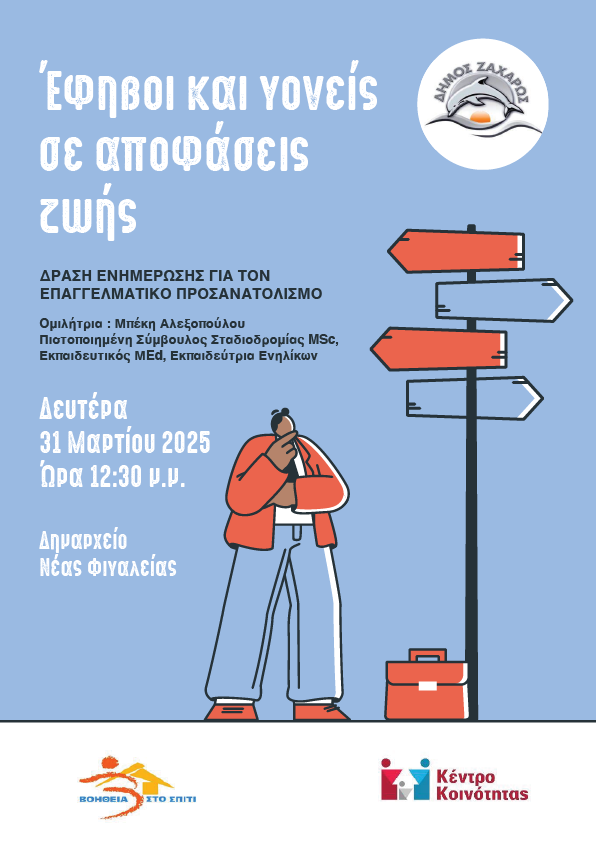 Ο Δήμος Ζαχάρως μέσω του Κέντρου Κοινότητας και του προγράμματος «Βοήθεια στο Σπίτι» σε συνεργασία με το Σύλλογο Γονέων και Κηδεμόνων του Γυμνασίου και Λυκείου Ζαχάρως διοργανώνει ενημερωτική εκδήλωση με θέμα “Έφηβοι και Γονείς σε Αποφάσεις Ζωής”, με στόχο την υποστήριξη των γονέων – κηδεμόνων στον σημαντικό τους ρόλο στη διαμόρφωση του μέλλοντος των παιδιών τους. Ομιλήτρια : Η εκδήλωση θα φιλοξενήσει την Μπέκη Αλεξοπούλου, ειδική σύμβουλο επαγγελματικού προσανατολισμού, η οποία θα αναλύσει τους τρόπους με τους οποίους οι γονείς- κηδεμόνες μπορούν να καθοδηγήσουν αποτελεσματικά τα παιδιά τους στις εκπαιδευτικές τους επιλογές.
