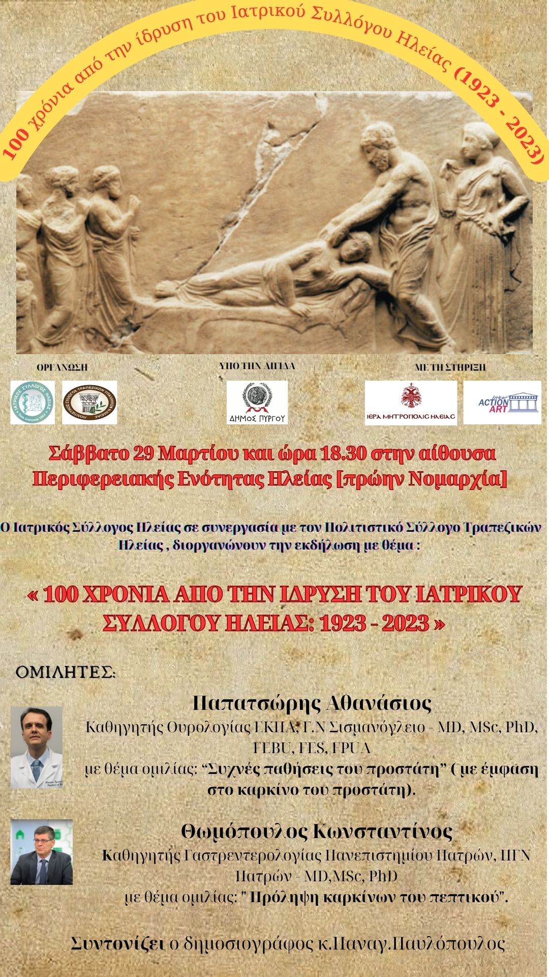 Συνέντευξη τύπου από τους οργανωτές της μεγάλης εκδήλωσης που θα γίνει το Σάββατο 29η Μαρτίου και ωρα 6,30μμ , στην Αίθουσα Συνεδριάσεων της Περιφερειακής Ενότητας Ηλείας[ πρώην Νομαρχία] ο ΙΑΤΡΙΚΟΣ ΣΥΛΛΟΓΟΣ ΗΛΕΙΑΣ σε συνεργασία με τον ΠΟΛΙΤΙΣΤΙΚΟ ΣΥΛΛΟΓΟ ΤΡΑΠΕΖΙΚΩΝ ΥΠΑΛΛΗΛΩΝ Ν.ΗΛΕΙΑΣ ,για τα 100 χρόνια από την ίδρυση του Ιατρικού Συλλόγου ,λόγω της παρουσίας των εκλεκτών ομιλητών.