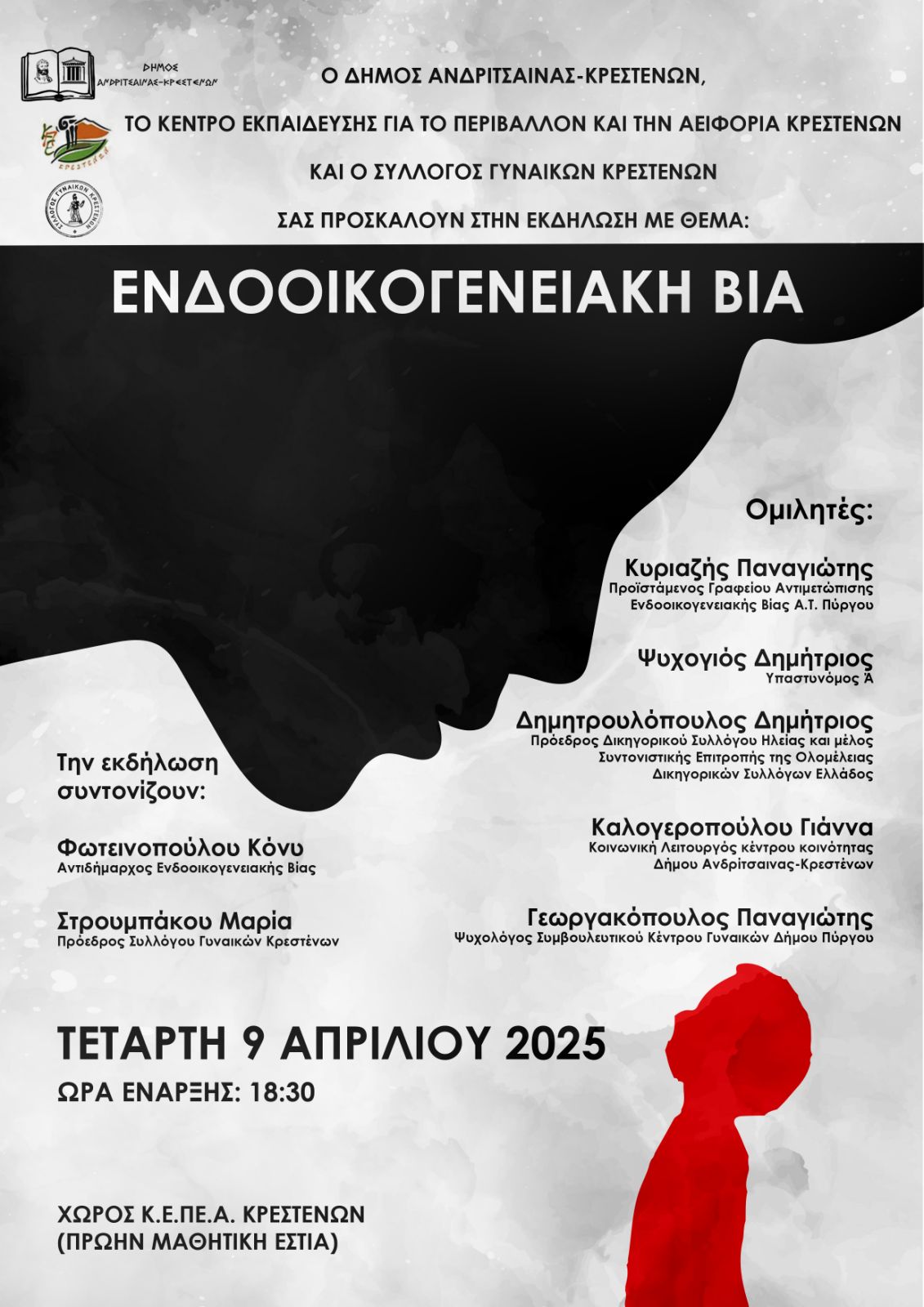 Την εκδήλωση συντονίζουν οι, Φωτεινοπούλου Κόνυ Αντιδήμαρχος Ενδοοικογενειακής Βίας και Στρουμπάκου Μαρία πρόεδρος Συλλόγου Γυναικών Κρεστένων.