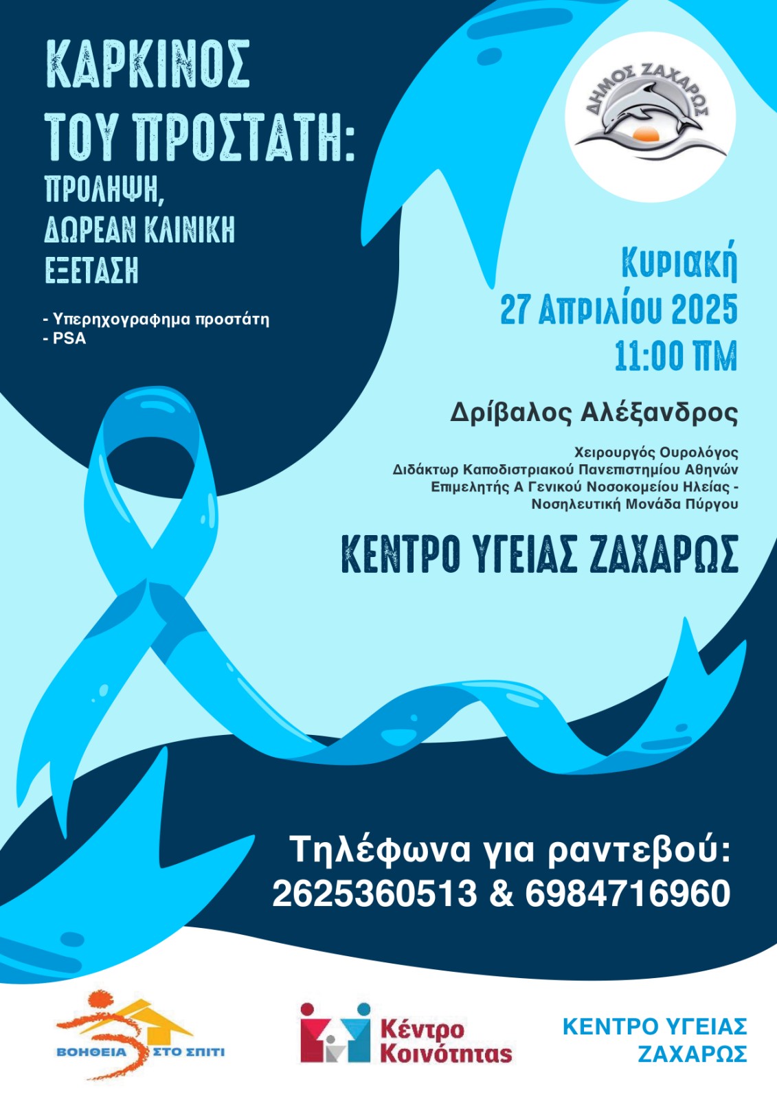 Ο Δήμος Ζαχάρως, μέσω του Κέντρου Κοινότητας και του προγράμματος Βοήθεια στο Σπίτι, σε συνεργασία με το Κέντρο Υγείας Ζαχάρως, διοργανώνει ενημερωτική εκδήλωση για την πρόληψη και έγκαιρη διάγνωση του Καρκίνου του Προστάτη, την Κυριακή 27 Απριλίου 2025 και ώρα 11:00 π.μ. στο Κέντρο Υγείας Ζαχάρως.