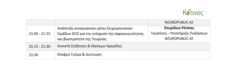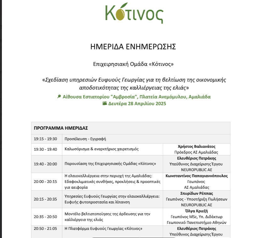 Σας προσκαλούμε στην Ημερίδα ενημέρωσης για την Ευφυή Γεωργία στην Ελαιοκαλλιέργεια, στο πλαίσιο του έργου «Κότινος» 28 ΑΠΡΙΛΙΟΥ 2025 στις 19:15 μ.μ.