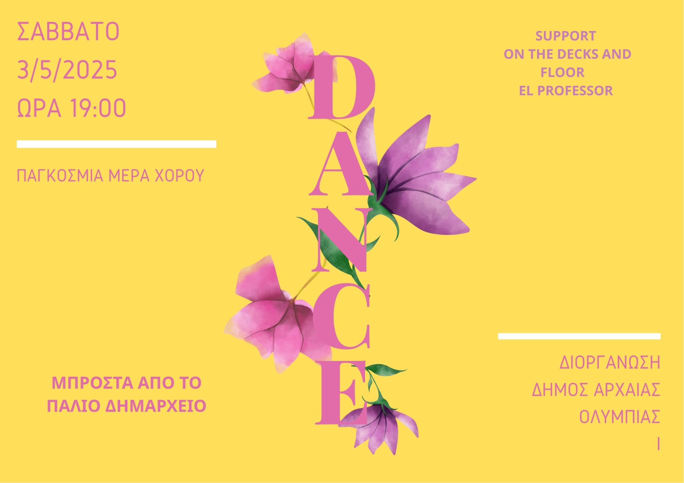 Ο Δήμος Αρχαίας Ολυμπίας, με αφορμή την Παγκόσμια Ημέρα Χορού (29 Απριλίου), σας προσκαλεί σε μια μοναδική βραδιά αφιερωμένη στην τέχνη της κίνησης, της έκφρασης και της ένωσης των ανθρώπων μέσα από τον χορό, το Σάββατο 3 Μαΐου 2025 και ώρα 19:00 στη Πλατεία του Παλιού Δημαρχείου Αρχαίας Ολυμπίας.