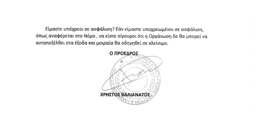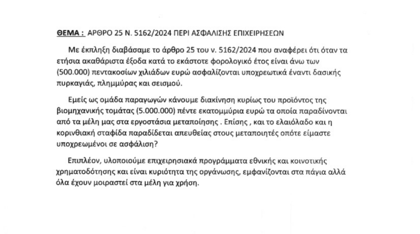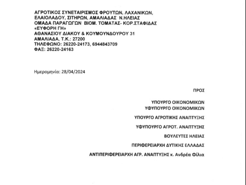 Επιστολή προς όλους τους αρμόδιους έστειλε ο Πρόεδρος της Ομάδας Παραγωγών Αμαλιάδας, Χρήστος Βαλιανάτος, επισημαίνοντας τον κίνδυνο να κλείσει η οργάνωση, με αφορμή το άρθρο νόμου περί ασφάλισης επιχειρήσεων.