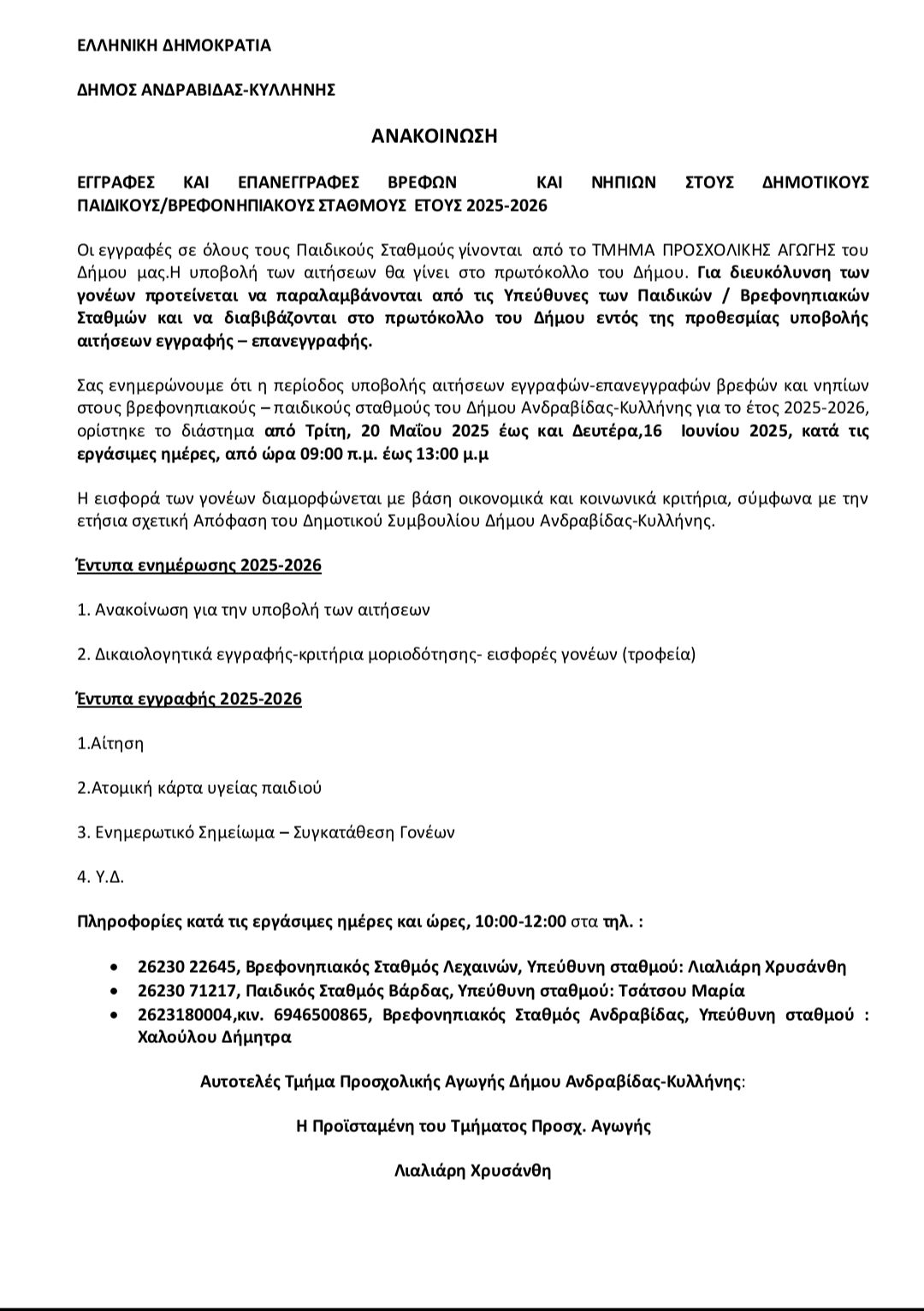 «Για εμάς στον Δήμο Ανδραβίδας-Κυλλήνης, η προσχολική αγωγή αποτελεί θεμέλιο λίθο για την ολόπλευρη ανάπτυξη των παιδιών μας και γι’ αυτό επενδύουμε σταθερά στη στήριξη των οικογενειών του τόπου μας. Οι Παιδικοί και Βρεφονηπιακοί Σταθμοί του Δήμου μας συμμετέχουν δυναμικά στο φετινό πρόγραμμα δημιουργικής απασχόλησης, με στόχο να προσφέρουν ένα ασφαλές, ζεστό και παιδαγωγικά ποιοτικό περιβάλλον για κάθε παιδί.