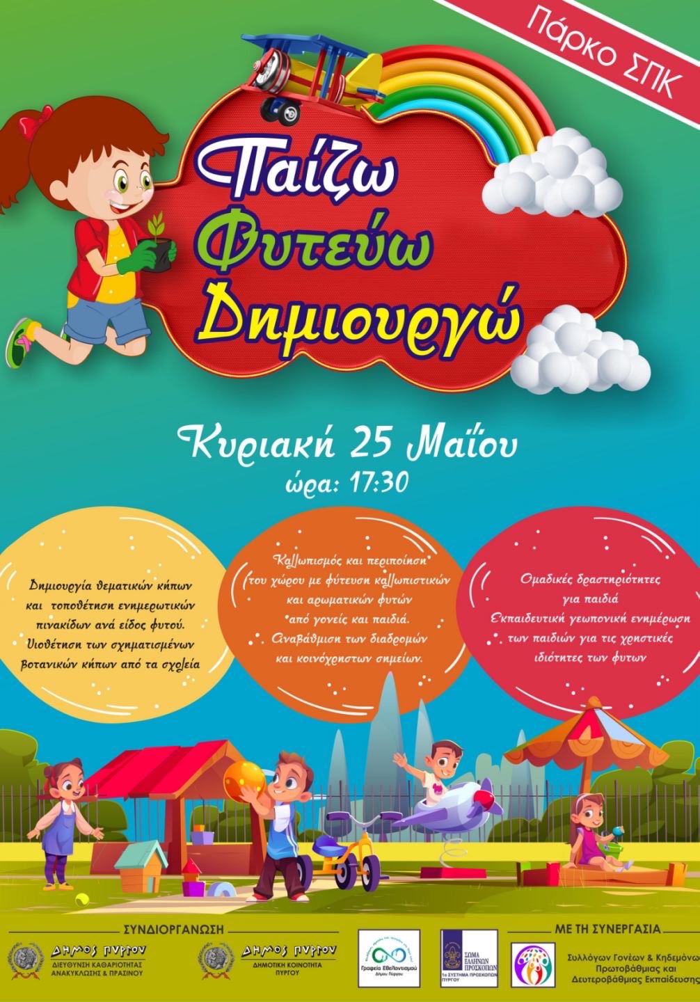 ✅ Στην εκδήλωση, παίζω, φυτεύω και δημιουργώ, συμμετέχουν η Δημοτική Κοινότητα Πύργου, το Γραφείο Εθελοντισμού Δήμου Πύργου, το 1ο Σύστημα Προσκόπων Πύργου και οι Σύλλογοι Γονέων & Κηδεμόνων Δευτεροβάθμιας Εκπαίδευσης.