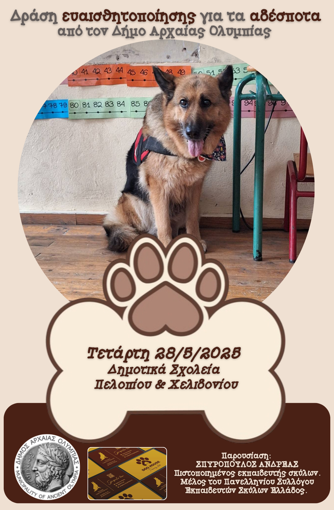 Ο Δήμος Αρχαίας Ολυμπίας, με πρωτοβουλία του αρμόδιου Αντιδημάρχου για τα αδέσποτα ζώα, Δημοσθένη Κατσίκα, συνεχίζει τις ενημερωτικές δράσεις ευαισθητοποίησης των μαθητών για τα αδέσποτα ζώα, στα σχολεία της Πρωτοβάθμιας και Δευτεροβάθμιας Εκπαίδευσης του Δήμου. Επόμενη στάση στα Δημοτικά Σχολεία Χελιδονίου και Πελοπίου, την Τετάρτη, 28 Μαΐου 2025.