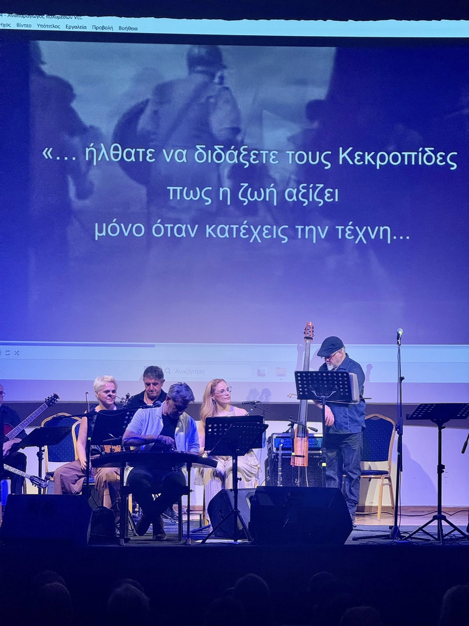 Το έργο παρουσιάστηκε επιλεγμένα σε αποσπάσματα, ζωντανά επί σκηνής, με τις εξαιρετικές ερμηνείες της Άντας Αθανασοπούλου και του Γεράσιμου Ανδρεάτου, ενώ στην αφήγηση η Χρύσα Ρώμα μετέφερε με βαθύτητα και σεβασμό το πνεύμα της Ιωνικής γης με τον συνθέτη στο πιάνο. Η μουσική ζωντάνεψε από μία επίλεκτη ορχήστρα του Δημοτικού Ωδείου Χαλανδρίου με τη διεύθυνση του μαέστρου και τη συμμετοχή σημαντικών σολίστ: