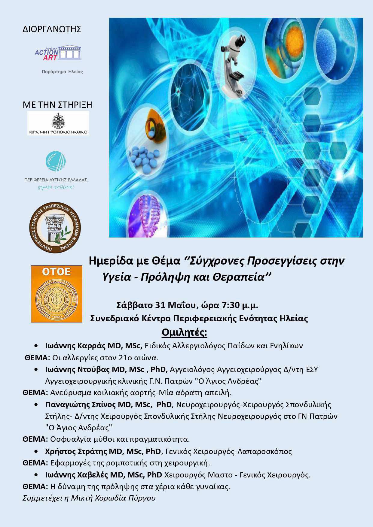 Μια νέα μεγάλη,όσο και πρωτότυπη Εκδήλωση-Ημερίδα διοργανώνει το δραστήριο Παράρτημα της Περιφ.Ηλείας του Διεθνούς Οργανισμού της international Action Art ,το Σάββατο 31η Μαϊου ,ωρα 7,30μμ στο Συνεδριακό Κέντρο της Περιφερειακής Ενότητας Ηλείας [πρώην Νομαρχία] με Θέμα ”Σύγχρονες Προσεγγίσεις” στην Υγεία Πρόληψη και Θεραπεία από την Κεφαλή έως τα άκρα” Απευθύνεται στο ευρύ κοινό και είναι μια ολιστική προσέγγιση στην Υγεία μέσα από 5 ειδικότητες και αφορά στο τί πρέπει να γνωρίζουμε για να προλάβουμε και να θεραπεύσουμε εγκαίρως ενα μεγάλο φάσμα ασθενειών που συναντουμε καθημερινα στο περιβάλλον μας ,με κατανοητό τρόπο.Επίσης θα γίνουν σημαντικές ανακοινώσεις.