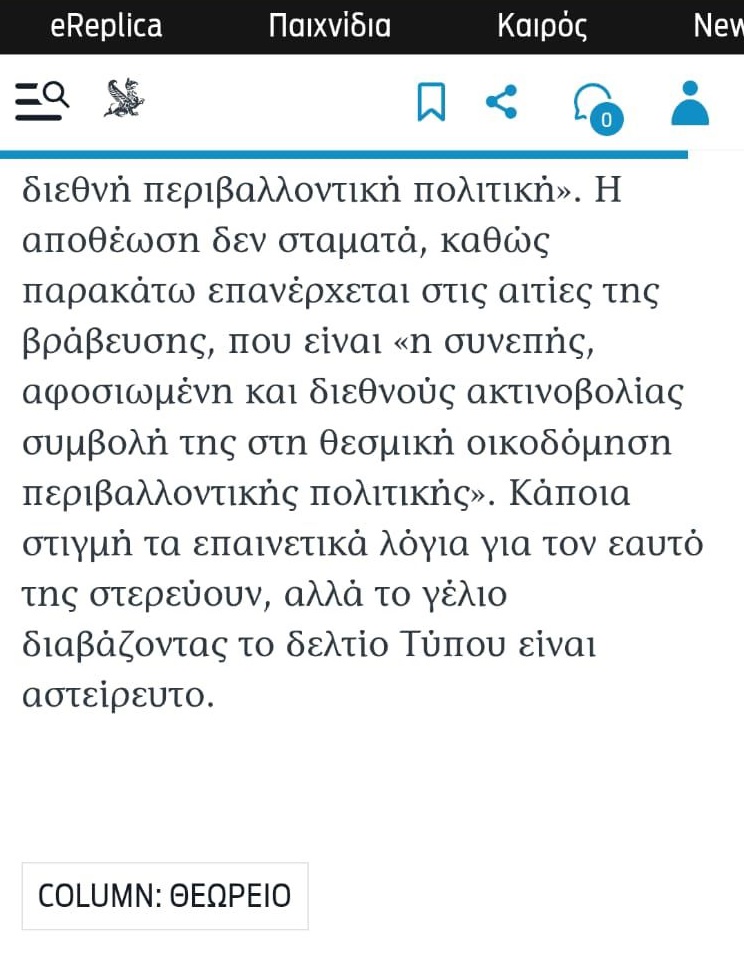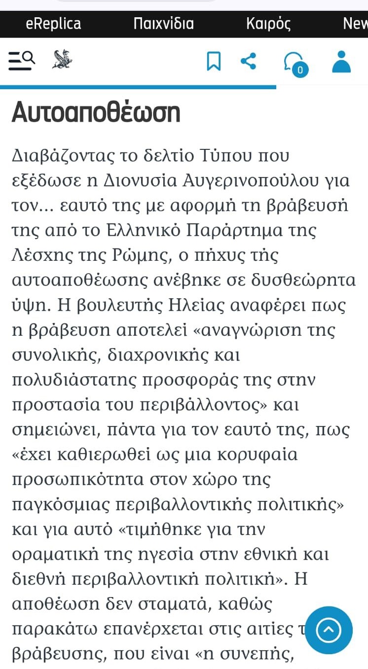 Το νέο άρθρο, με τίτλο «Αυτοαπωθέωση», ασκεί δριμεία κριτική στη στάση της βουλευτού, η οποία κατηγορείται για υπερπροβολή του εαυτού της και επικοινωνιακές υπερβολές σε ζητήματα που άπτονται της διαχείρισης θεμάτων πολιτικής προστασίας και περιβάλλοντος στην Ηλεία.
