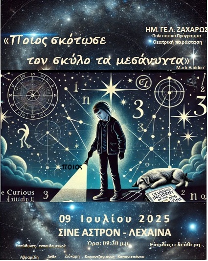 1) 09/07/2025: Σινέ Άστρον στα Λεχαινά: Ώρα Έναρξης 21:30. Θεατρική παράσταση με τίτλο « Ποιος σκότωσε τον σκύλο τα μεσάνυχτα» που βασίζεται στο πολυβραβευμένο μυθιστόρημα του Μαρκ Χάντον με την θεατρικής ομάδας του Ημ. ΓΕ.Λ. Ζαχάρως. Είσοδος δωρεάν για το κοινό.