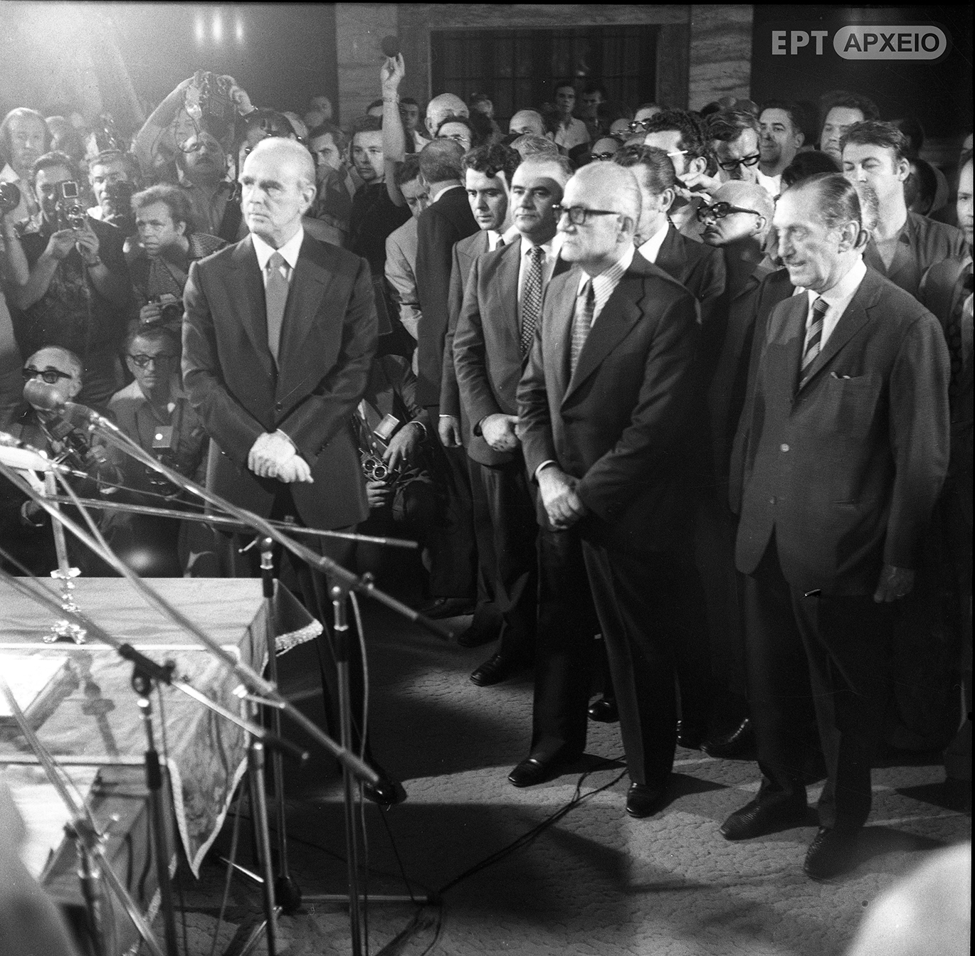 Ο Καραμανλής συγκροτεί κυβέρνηση εθνικής ενότητας και σε λίγους μήνες προκηρύσσει ελεύθερες εκλογές και δημοψήφισμα για τη μορφή του πολιτεύματος. Στις 8 Δεκεμβρίου 1974 ο λαός απορρίπτει με 69,2% τη Βασιλευόμενη Δημοκρατία και επιλέγει το πολίτευμα της Προεδρευόμενης Κοινοβουλευτικής Δημοκρατίας. Το Σύνταγμα του 1975, που τίθεται σε ισχύ στις 11 Ιουνίου εκείνου του έτους, θεμελιώνει το νέο θεσμικό πλαίσιο της χώρας.