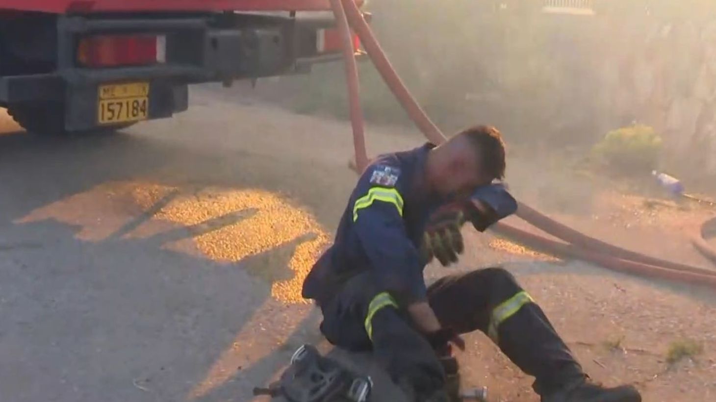 Κάθεται στο έδαφος δίπλα από ένα πυροσβεστικό όχημα, βγάζοντας το κράνος και τα προστατευτικά του γάντια, μετά από τιτάνια προσπάθεια.