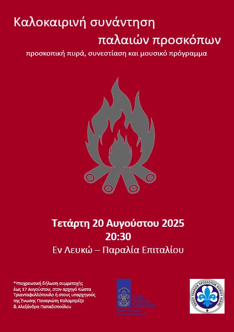 Το ραντεβού,για εφέτος είναι για αυτην την Τετάρτη 20η Αυγούστου… και 8,30μμ..στον ειδυλλιακά χώρο για εκδήλωση τέτοιου βελινεκούς ,στο ΄΄Εν Λευκώ”στην Παραλία Επιταλίου Στην κατά γενική διαπίστωση, από τα προηγούμενα χρόνια, επιτυχημένη Προσκοπική βραδιά-Θεσμό, προσκαλούνται να συμμετάσχουν κι φέτος, όχι μόνο τα μέλη της Ένωσης Παλαιών Προσκόπων Ηλείας, που οργανώνουν την εκδήλωση, αλλά και όσοι στα νεανικά τους χρόνια συμμετείχαν στις Προσκοπικές ομάδες και επιθυμούν να αναπολήσουν και να ξαναζήσουν τις όμορφες και ανεξίτηλες στιγμές αυτών των εποχών.