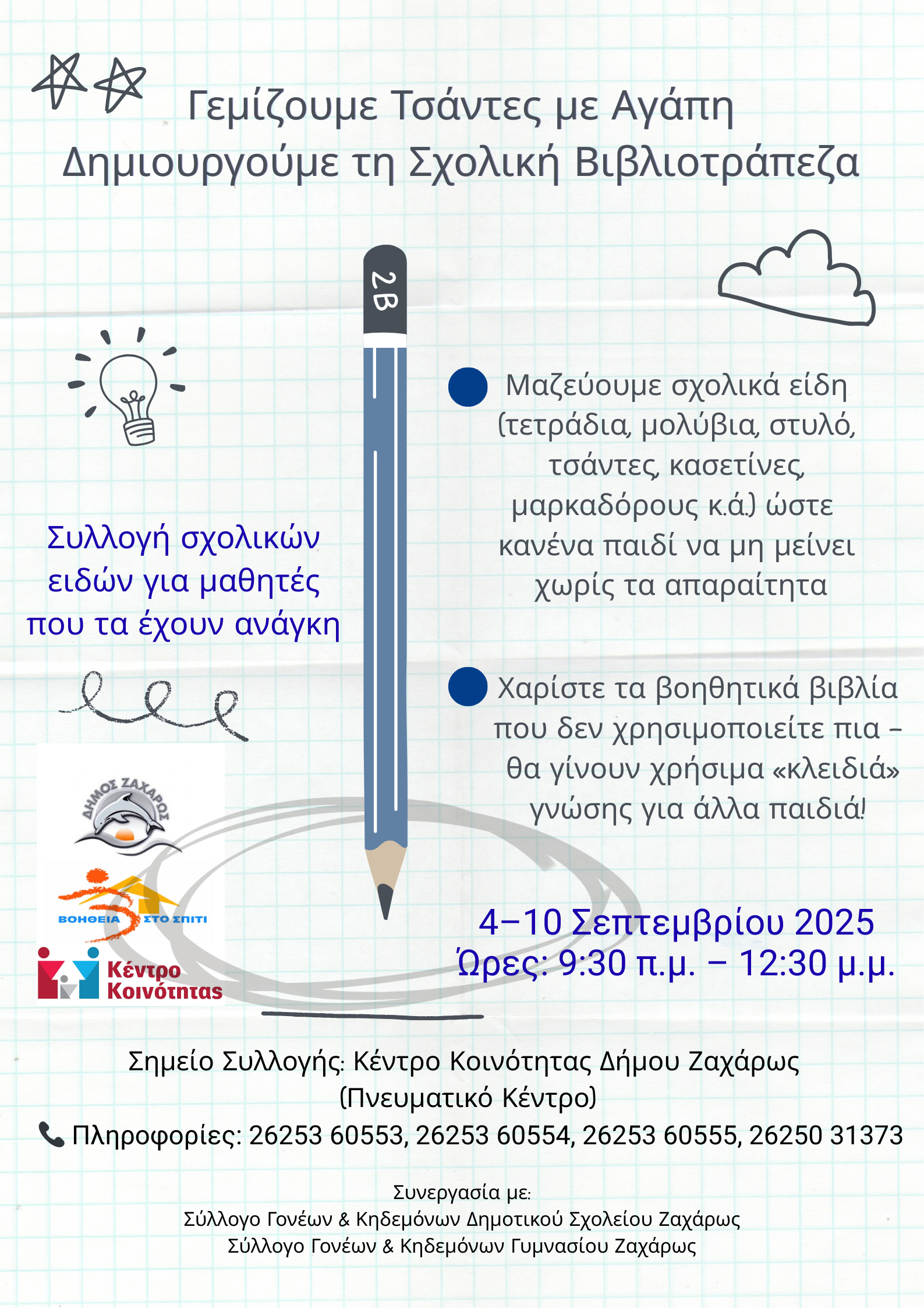 Ο Δήμος Ζαχάρως, μέσα από το Κέντρο Κοινότητας και το πρόγραμμα «Βοήθεια στο Σπίτι», στηρίζει τους μαθητές όλων των βαθμίδων και τις οικογένειες που έχουν ανάγκη, με δύο δράσεις αλληλεγγύης για τη νέα σχολική χρονιά.